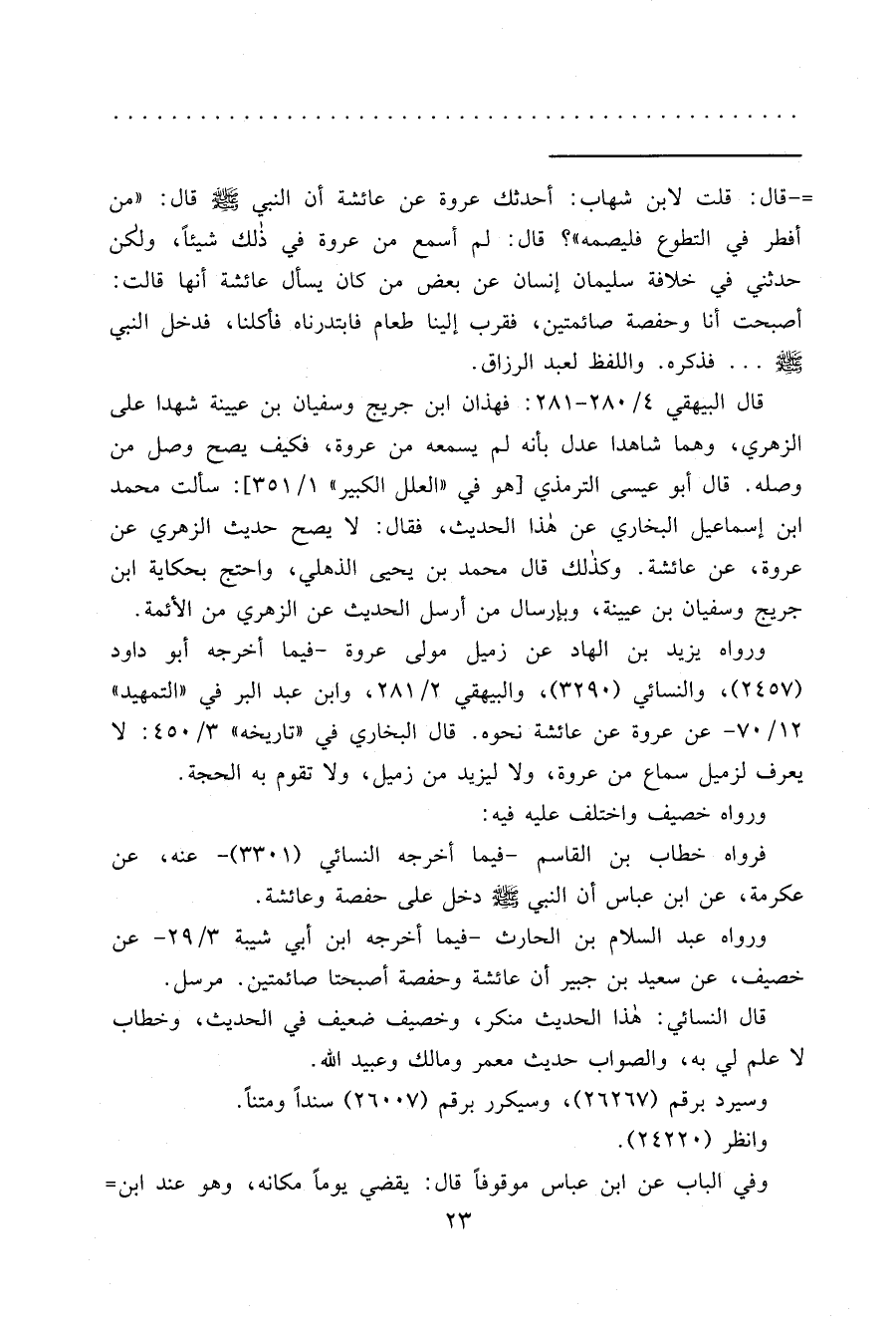 قال البيهقي ٤/٢٨٠- ٢٨١: فهذان ابن جريج وسفيان بن عيينة شهدا على الزهري، وهما شاهدا عدل بأنه لم يسمعه من عروة، فكيف يصح وصل من وصله. قال أبو عيسى الترمذي [هو في "العلل الكبير" ١/٣٥١] : سألت محمد ابن إسماعيل البخاري عن هذا الحديث، فقال: لا يصح حديث الزهري عن عروة، عن عائشة. وكذلك قال محمد بن يحيى الذهلي، واحتج بحكاية ابن جريج وسفيان بن عيينة، وبإرسال من أرسل الحديث عن الزهري من الأئمة.