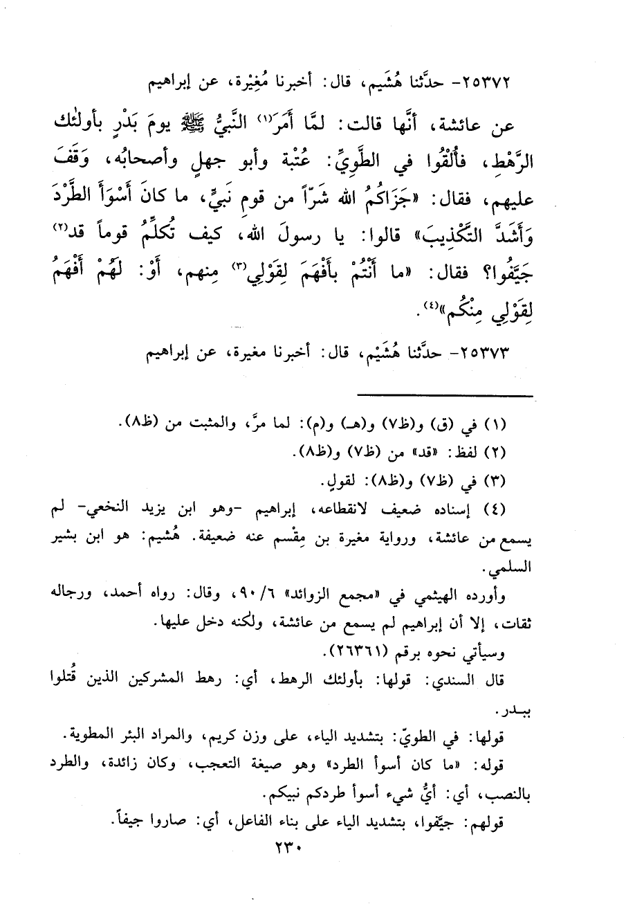 ٢٥٣٧٢ - حَدَّثَنَا هُشَيْمٌ، قَالَ: أَخْبَرَنَا مُغِيرَةُ، عَنْ إِبْرَاهِيمَ، عَنْ عَائِشَةَ، أَنَّهَا قَالَتْ: لَمَّا أَمَرَ (١) النَّبِيُّ صَلَّى اللهُ عَلَيْهِ وَسَلَّمَ يَوْمَ بَدْرٍ بِأُولَئِكَ الرَّهْطِ، فَأُلْقُوا فِي الطَّوِيِّ: عُتْبَةُ وَأَبُو جَهْلٍ وَأَصْحَابُهُ، وَقَفَ عَلَيْهِمْ، فَقَالَ: " جَزَاكُمُ اللهُ شَرًّا مِنْ قَوْمِ نَبِيٍّ، مَا كَانَ أَسْوَأَ الطَّرْدِ وَأَشَدَّ التَّكْذِيبِ " قَالُوا: يَا رَسُولَ اللهِ، كَيْفَ تُكَلِّمُ قَوْمًا قَدْ (٢) جَيَّفُوا؟ فَقَالَ: " مَا أَنْتُمْ بِأَفْهَمَ لِقَوْلِي (٣) مِنْهُمْ، أَوْ: لَهُمْ أَفْهَمُ لِقَوْلِي مِنْكُمْ " (٤)