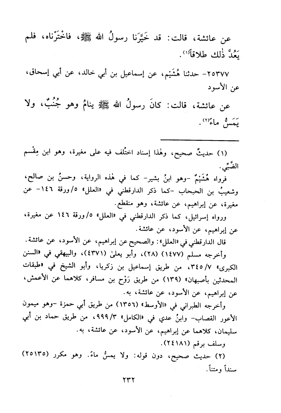 ٢٥٣٧٧ - حَدَّثَنَا هُشَيْمٌ، عَنْ إِسْمَاعِيلَ بْنِ أَبِي خَالِدٍ، عَنْ أَبِي إِسْحَاقَ، عَنِ الْأَسْوَدِ، عَنْ عَائِشَةَ، قَالَتْ: " كَانَ رَسُولُ اللهِ صَلَّى اللهُ عَلَيْهِ وَسَلَّمَ يَنَامُ وَهُوَ جُنُبٌ، وَلَا يَمَسُّ مَاءً " (٢)