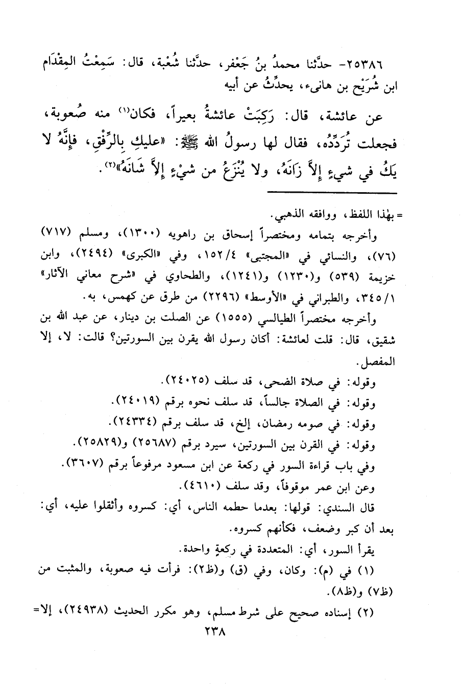 ٢٥٣٨٦ - حَدَّثَنَا مُحَمَّدُ بْنُ جَعْفَرٍ، حَدَّثَنَا شُعْبَةُ، قَالَ: سَمِعْتُ الْمِقْدَامَ بْنَ شُرَيْحِ بْنِ هَانِىءٍ، يُحَدِّثُ عَنْ أَبِيهِ، عَنْ عَائِشَةَ، قَالَ: رَكِبَتْ عَائِشَةُ بَعِيرًا، فَكَانَ (١) مِنْهُ صُعُوبَةٌ، فَجَعَلَتْ تُرَدِّدُهُ، فَقَالَ لَهَا رَسُولُ اللهِ صَلَّى اللهُ عَلَيْهِ وَسَلَّمَ: " عَلَيْكِ بِالرِّفْقِ، فَإِنَّهُ لَا يَكُ فِي شَيْءٍ إِلَّا زَانَهُ، وَلَا يُنْزَعُ مِنْ شَيْءٍ إِلَّا شَانَهُ " (٢)