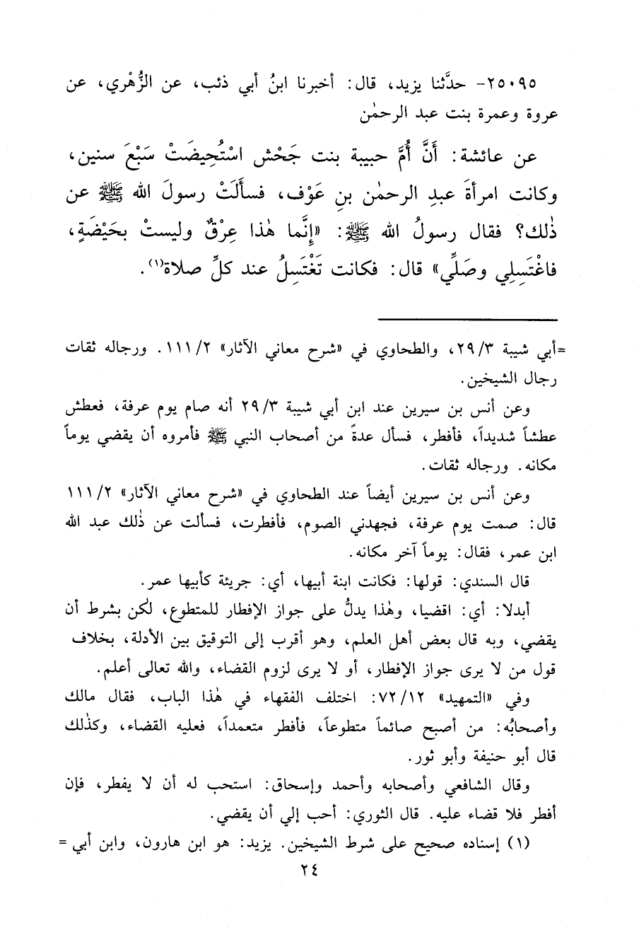 ٢٥٠٩٥ - حَدَّثَنَا يَزِيدُ، قَالَ: أَخْبَرَنَا ابْنُ أَبِي ذِئْبٍ، عَنِ الزُّهْرِيِّ، عَنْ عُرْوَةَ، وَعَمْرَةَ بِنْتِ عَبْدِ الرَّحْمَنِ، عَنْ عَائِشَةَ: أَنَّ أُمَّ حَبِيبَةَ بِنْتَ جَحْشٍ اسْتُحِيضَتْ سَبْعَ سِنِينَ، وَكَانَتْ امْرَأَةَ عَبْدِ الرَّحْمَنِ بْنِ عَوْفٍ، فَسَأَلَتْ رَسُولَ اللهِ صَلَّى اللهُ عَلَيْهِ وَسَلَّمَ عَنْ ذَلِكَ؟ فَقَالَ رَسُولُ اللهِ صَلَّى اللهُ عَلَيْهِ وَسَلَّمَ: " إِنَّمَا هَذَا عِرْقٌ وَلَيْسَتْ بِحَيْضَةٍ، فَاغْتَسِلِي وَصَلِّي " قَالَ: فَكَانَتْ تَغْتَسِلُ عِنْدَ كُلِّ صَلَاةٍ (١)