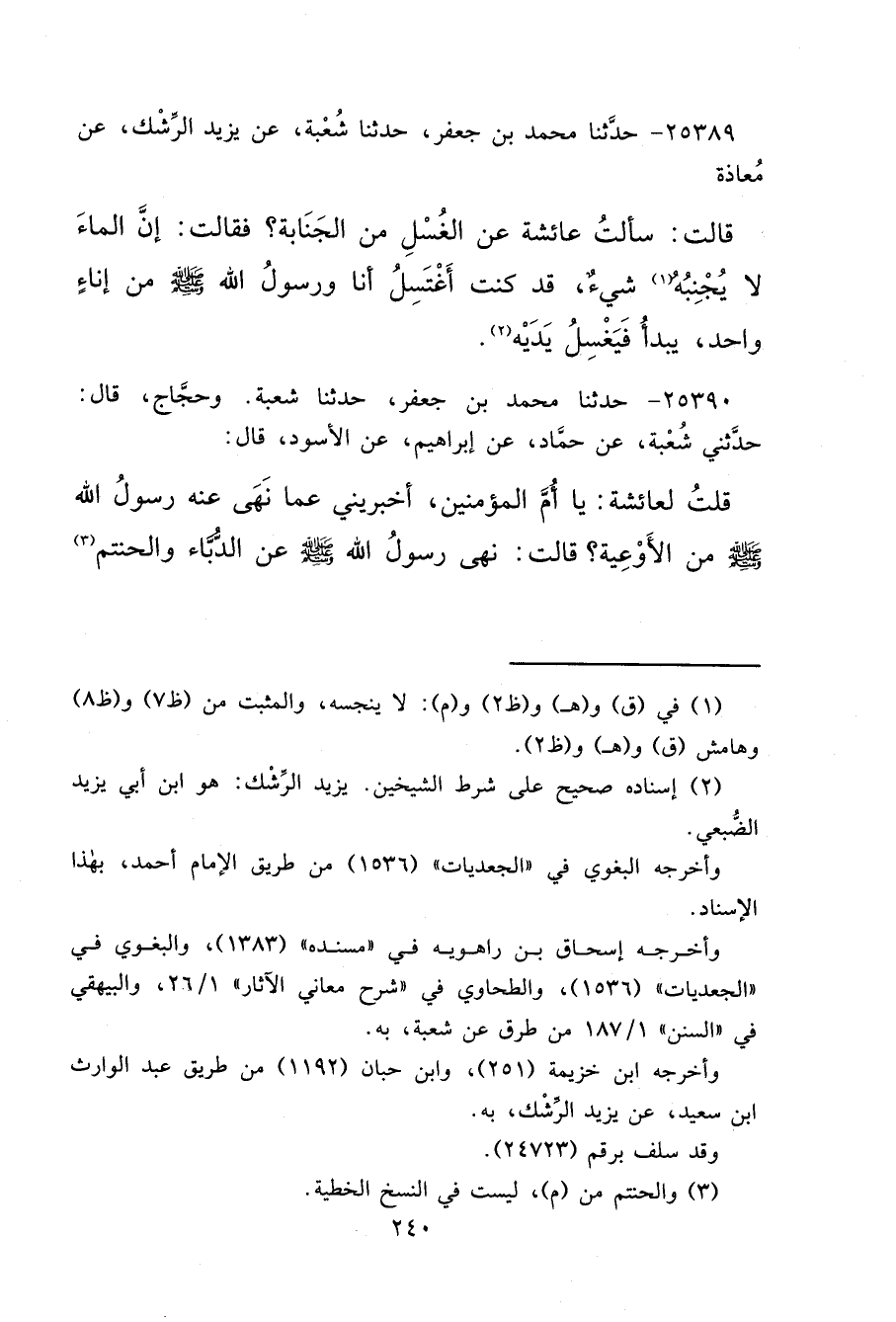 ٢٥٣٨٩ - حَدَّثَنَا مُحَمَّدُ بْنُ جَعْفَرٍ، حَدَّثَنَا شُعْبَةُ، عَنْ يَزِيدَ الرِّشْكِ، عَنْ مُعَاذَةَ، قَالَتْ: سَأَلْتُ عَائِشَةَ، عَنِ الْغُسْلِ مِنَ الْجَنَابَةِ؟ فَقَالَتْ: " إِنَّ الْمَاءَ لَا يُجَنِّبُهُ (١) شَيْءٌ، قَدْ كُنْتُ أَغْتَسِلُ أَنَا وَرَسُولُ اللهِ صَلَّى اللهُ عَلَيْهِ وَسَلَّمَ مِنْ إِنَاءٍ وَاحِدٍ، يَبْدَأُ فَيَغْسِلُ يَدَيْهِ " (٢)