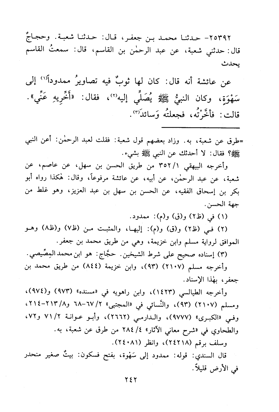 ٢٥٣٩٢ - حَدَّثَنَا مُحَمَّدُ بْنُ جَعْفَرٍ، قَالَ: حَدَّثَنَا شُعْبَةُ، وَحَجَّاجٌ، قَالَ: حَدَّثَنِي شُعْبَةُ، عَنْ عَبْدِ الرَّحْمَنِ بْنِ الْقَاسِمِ، قَالَ: سَمِعْتُ الْقَاسِمَ، يُحَدِّثُ: عَنْ عَائِشَةَ، أَنَّهُ قَالَ: كَانَ لَهَا ثَوْبٌ فِيهِ تَصَاوِيرُ مَمْدُودًا (١) إِلَى سَهْوَةٍ، وَكَانَ النَّبِيُّ صَلَّى اللهُ عَلَيْهِ وَسَلَّمَ يُصَلِّي إِلَيْهِ، (٢) فَقَالَ: " أَخِّرِيهِ عَنِّي " قَالَتْ: فَأَخَّرْتُهُ، فَجَعَلْتُهُ وَسَائِدَ (٣)