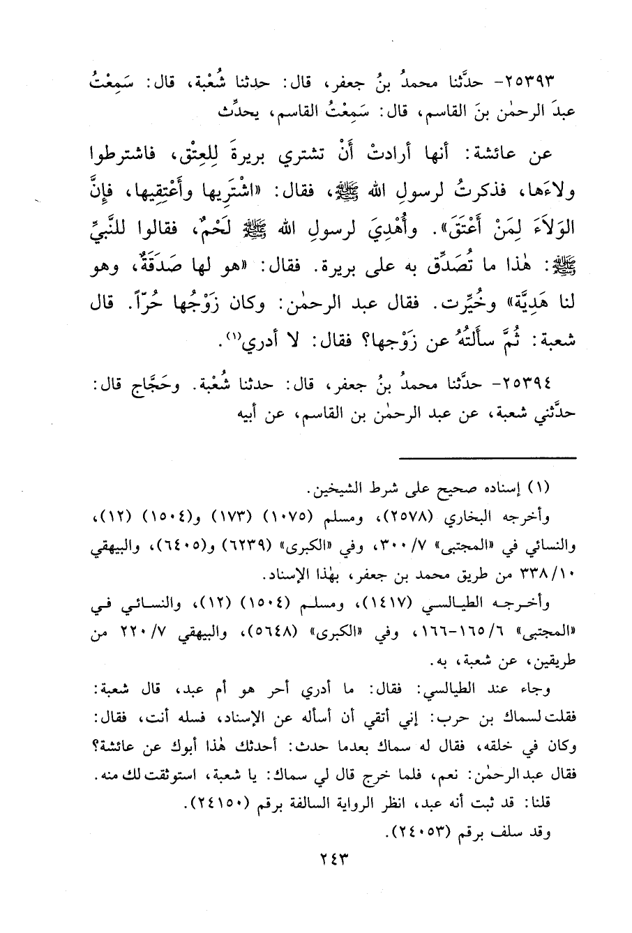 ٢٥٣٩٣ - حَدَّثَنَا مُحَمَّدُ بْنُ جَعْفَرٍ، قَالَ: حَدَّثَنَا شُعْبَةُ، قَالَ: سَمِعْتُ عَبْدَ الرَّحْمَنِ بْنَ الْقَاسِمِ، قَالَ: سَمِعْتُ الْقَاسِمَ، يُحَدِّثُ: عَنْ عَائِشَةَ: أَنَّهَا أَرَادَتْ أَنْ تَشْتَرِيَ بَرِيرَةَ لِلْعِتْقِ، فَاشْتَرَطُوا وَلَاءَهَا، فَذَكَرَتْ لِرَسُولِ اللهِ صَلَّى اللهُ عَلَيْهِ وَسَلَّمَ فَقَالَ: " اشْتَرِيهَا وَأَعْتِقِيهَا، فَإِنَّ الْوَلَاءَ لِمَنْ أَعْتَقَ "