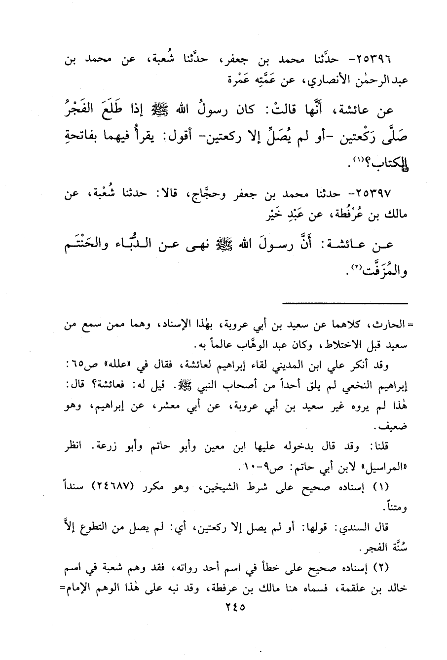 ٢٥٣٩٦ - حَدَّثَنَا مُحَمَّدُ بْنُ جَعْفَرٍ، حَدَّثَنَا شُعْبَةُ، عَنْ مُحَمَّدِ بْنِ عَبْدِ الرَّحْمَنِ الْأَنْصَارِيِّ، عَنْ عَمَّتِهِ عَمْرَةَ، عَنْ عَائِشَةَ، أَنَّهَا قَالَتْ: " كَانَ رَسُولُ اللهِ صَلَّى اللهُ عَلَيْهِ وَسَلَّمَ إِذَا طَلَعَ الْفَجْرُ صَلَّى رَكْعَتَيْنِ - أَوْ لَمْ يُصَلِّ إِلَّا رَكْعَتَيْنِ - " أَقُولُ: يَقْرَأُ فِيهِمَا بِفَاتِحَةِ الْكِتَابِ؟ (١)