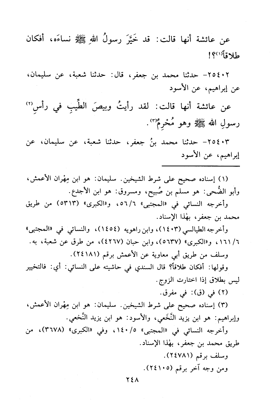 ٢٥٤٠٢ - حَدَّثَنَا مُحَمَّدُ بْنُ جَعْفَرٍ، قَالَ: حَدَّثَنَا شُعْبَةُ، عَنْ سُلَيْمَانَ، عَنْ إِبْرَاهِيمَ، عَنِ الْأَسْوَدِ، عَنْ عَائِشَةَ، أَنَّهَا قَالَتْ: " لَقَدْ رَأَيْتُ وَبِيصَ الطِّيبِ فِي رَأْسِ (٢) رَسُولِ اللهِ صَلَّى اللهُ عَلَيْهِ وَسَلَّمَ وَهُوَ مُحْرِمٌ " (٣)