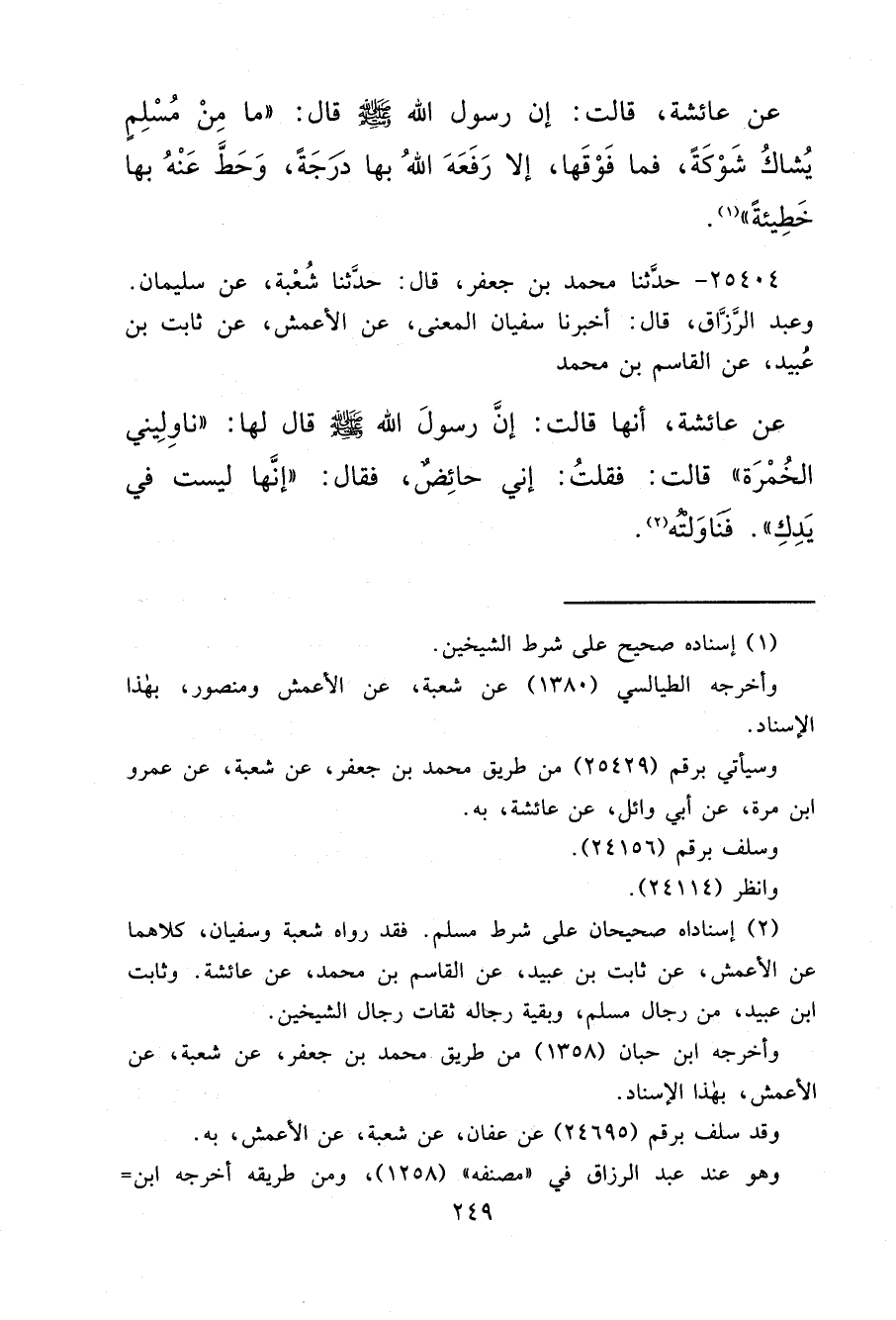 ٢٥٤٠٤ - حَدَّثَنَا مُحَمَّدُ بْنُ جَعْفَرٍ، قَالَ: حَدَّثَنَا شُعْبَةُ، عَنْ سُلَيْمَانَ، وَعَبْدِ الرَّزَّاقِ، قَالَ: أَخْبَرَنَا سُفْيَانُ الْمَعْنَى، عَنِ الْأَعْمَشِ، عَنْ ثَابِتِ بْنِ عُبَيْدٍ، عَنِ الْقَاسِمِ بْنِ مُحَمَّدٍ، عَنْ عَائِشَةَ، أَنَّهَا قَالَتْ: إِنَّ رَسُولَ اللهِ صَلَّى اللهُ عَلَيْهِ وَسَلَّمَ قَالَ لَهَا: " نَاوِلِينِي الْخُمْرَةَ " قَالَتْ: فَقُلْتُ: إِنِّي حَائِضٌ، فَقَالَ: " إِنَّهَا لَيْسَتْ فِي يَدِكِ " فَنَاوَلْتُهُ (٢)