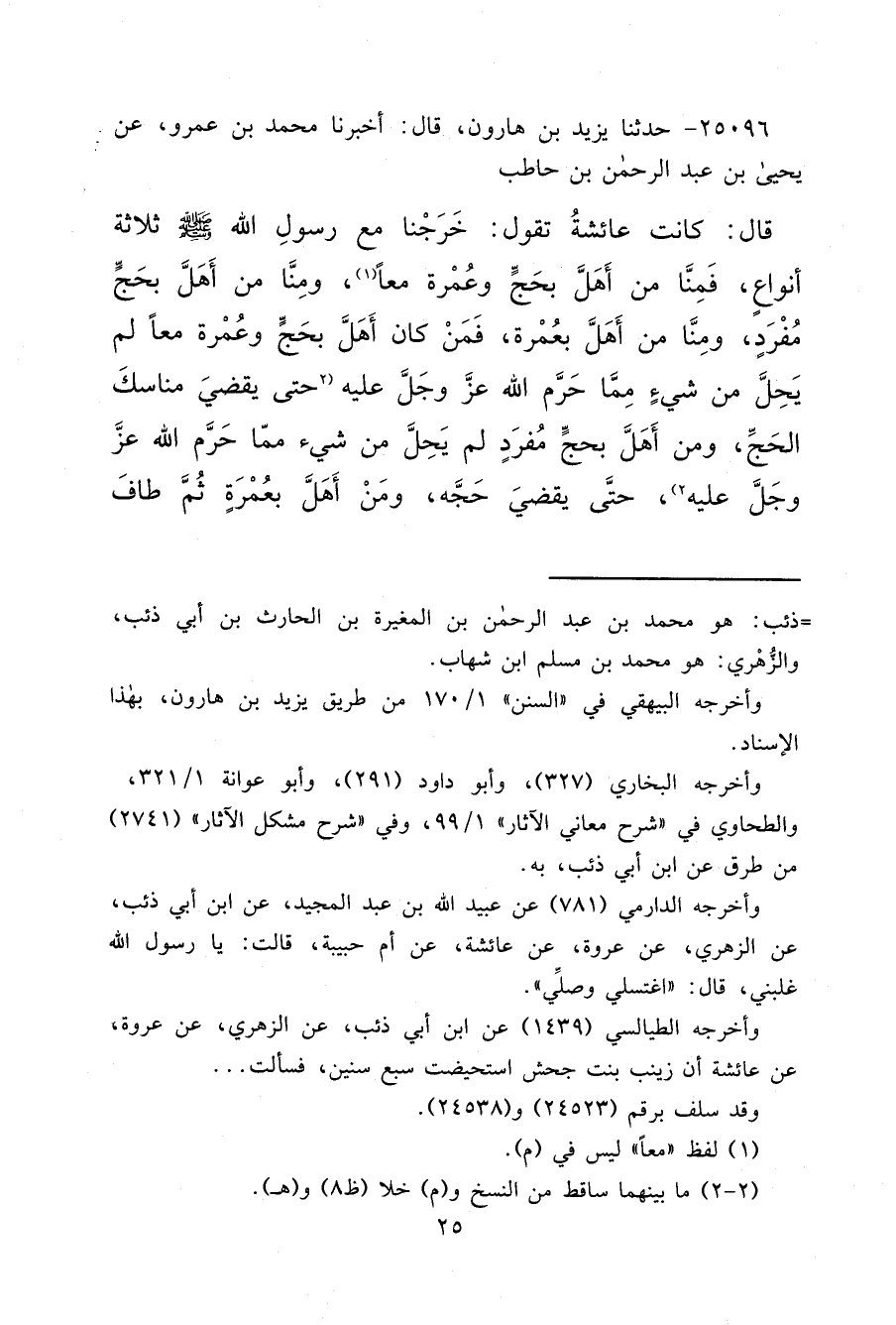 ٢٥٠٩٦ - حَدَّثَنَا يَزِيدُ بْنُ هَارُونَ، قَالَ: أَخْبَرَنَا مُحَمَّدُ بْنُ عَمْرٍو، عَنْ يَحْيَى بْنِ عَبْدِ الرَّحْمَنِ بْنِ حَاطِبٍ، قَالَ: كَانَتْ عَائِشَةُ، تَقُولُ: " خَرَجْنَا مَعَ رَسُولِ اللهِ صَلَّى اللهُ عَلَيْهِ وَسَلَّمَ ثَلَاثَةَ أَنْوَاعٍ: فَمِنَّا مَنْ أَهَلَّ بِحَجٍّ وَعُمْرَةٍ مَعًا، (١) وَمِنَّا مَنْ أَهَلَّ بِحَجٍّ مُفْرَدٍ، وَمِنَّا مَنْ أَهَلَّ بِعُمْرَةٍ، فَمَنْ كَانَ أَهَلَّ بِحَجٍّ وَعُمْرَةٍ مَعًا لَمْ يَحِلَّ مِنْ شَيْءٍ مِمَّا حَرَّمَ اللهُ عَزَّ وَجَلَّ عَلَيْهِ (٢) حَتَّى يَقْضِيَ مَنَاسِكَ الْحَجِّ، وَمَنْ أَهَلَّ بِحَجٍّ مُفْرَدٍ لَمْ يُحِلْ مِنْ شَيْءٍ مِمَّا حَرَّمَ اللهُ عَزَّ وَجَلَّ عَلَيْهِ (٢) حَتَّى يَقْضِيَ حَجَّهُ، وَمَنْ أَهَلَّ بِعُمْرَةٍ ثُمَّ طَافَ