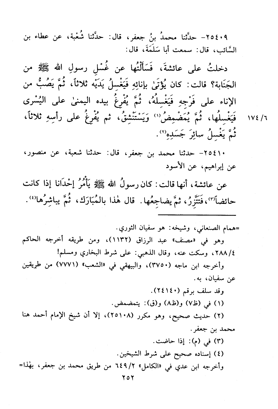 ٢٥٤٠٩ - حَدَّثَنَا مُحَمَّدُ بْنُ جَعْفَرٍ، قَالَ: حَدَّثَنَا شُعْبَةُ، عَنْ عَطَاءِ بْنِ السَّائِبِ، قَالَ: سَمِعْتُ أَبَا سَلَمَةَ، قَالَ: دَخَلْتُ عَلَى عَائِشَةَ، فَسَأَلْتُهَا عَنْ غُسْلِ رَسُولِ اللهِ صَلَّى اللهُ عَلَيْهِ وَسَلَّمَ مِنَ الْجَنَابَةِ؟ قَالَتْ: " كَانَ يُؤْتَى بِإِنَائِهِ فَيَغْسِلُ يَدَيْهِ ثَلَاثًا، ثُمَّ يَصُبُّ مِنَ الْإِنَاءِ عَلَى فَرْجِهِ فَيَغْسِلُهُ، ثُمَّ يُفْرِغُ بِيَدِهِ الْيُمْنَى عَلَى الْيُسْرَى فَيَغْسِلُهَا، ثُمَّ يُمَضْمِضُ (١) وَيَسْتَنْشِقُ، ثُمَّ يُفْرِغُ عَلَى رَأْسِهِ ثَلَاثًا، ثُمَّ يَغْسِلُ سَائِرَ جَسَدِهِ " (٢)