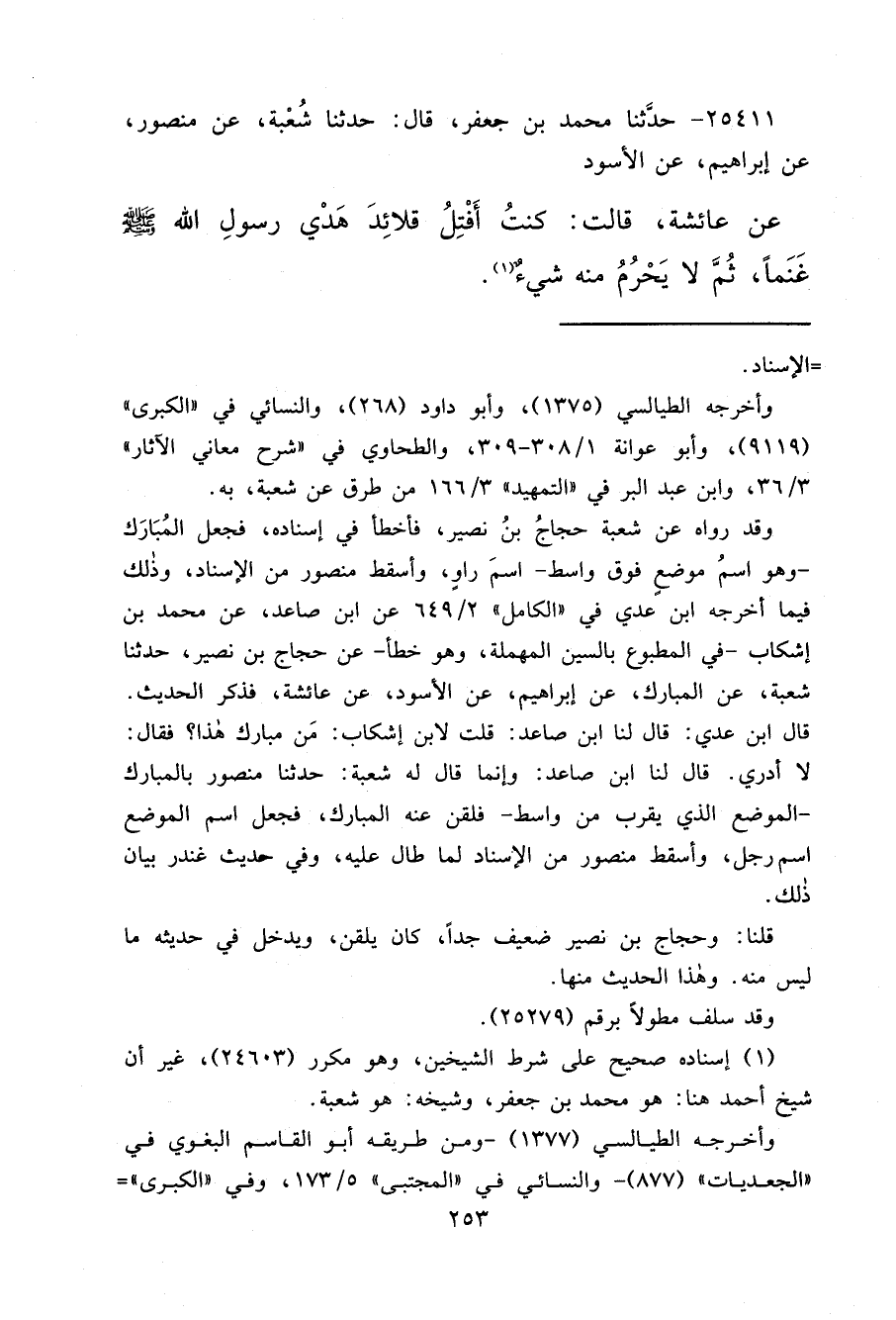 ٢٥٤١١ - حَدَّثَنَا مُحَمَّدُ بْنُ جَعْفَرٍ، قَالَ: حَدَّثَنَا شُعْبَةُ، عَنْ مَنْصُورٍ، عَنْ إِبْرَاهِيمَ، عَنِ الْأَسْوَدِ، عَنْ عَائِشَةَ، قَالَتْ: " كُنْتُ أَفْتِلُ قَلَائِدَ هَدْيِ رَسُولِ اللهِ صَلَّى اللهُ عَلَيْهِ وَسَلَّمَ غَنَمًا، ثُمَّ لَا يَحْرُمُ مِنْهُ شَيْءٌ " (١)