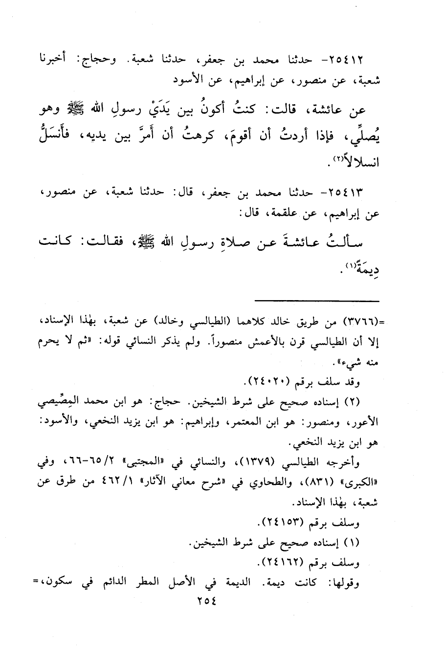 ٢٥٤١٣ - حَدَّثَنَا مُحَمَّدُ بْنُ جَعْفَرٍ، قَالَ: حَدَّثَنَا شُعْبَةُ، عَنْ مَنْصُورٍ، عَنْ إِبْرَاهِيمَ، عَنْ عَلْقَمَةَ، قَالَ: سَأَلْتُ عَائِشَةَ، عَنْ صَلَاةِ رَسُولِ اللهِ صَلَّى اللهُ عَلَيْهِ وَسَلَّمَ، فَقَالَتْ: " كَانَتْ دِيمَةً " (٢)