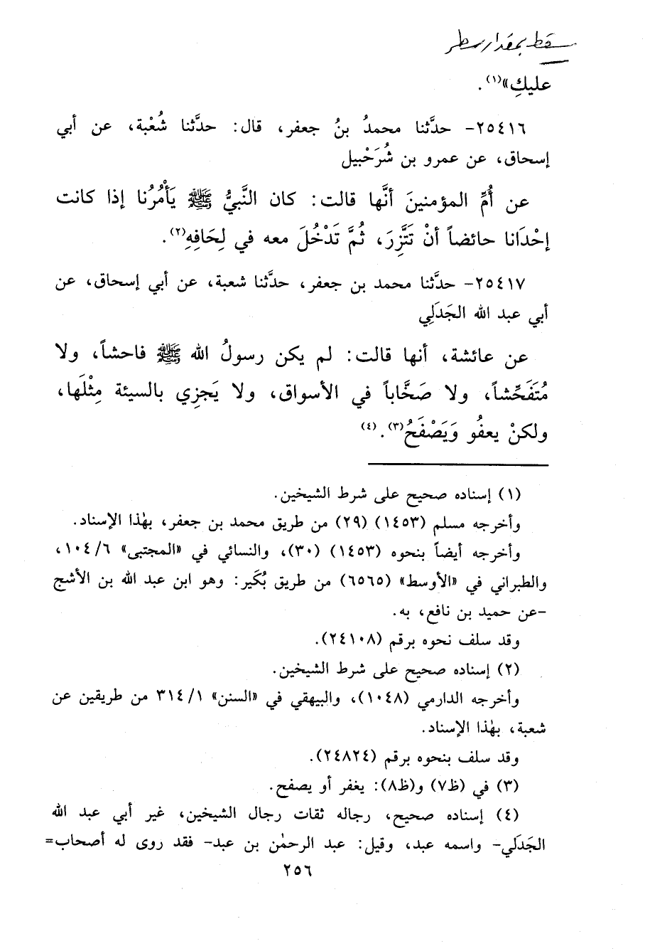 ٢٥٤١٧ - حَدَّثَنَا مُحَمَّدُ بْنُ جَعْفَرٍ، حَدَّثَنَا شُعْبَةُ، عَنْ أَبِي إِسْحَاقَ، عَنْ أَبِي عَبْدِ اللهِ الْجَدَلِيِّ، عَنْ عَائِشَةَ، أَنَّهَا قَالَتْ: " لَمْ يَكُنْ رَسُولُ اللهِ صَلَّى اللهُ عَلَيْهِ وَسَلَّمَ فَاحِشًا وَلَا مُتَفَحِّشًا، وَلَا صَخَّابًا فِي الْأَسْوَاقِ، وَلَا يُجْزِي بِالسَّيِّئَةِ مِثْلَهَا، وَلَكِنْ يَعْفُو وَيَصْفَحُ (٣) " (٤)