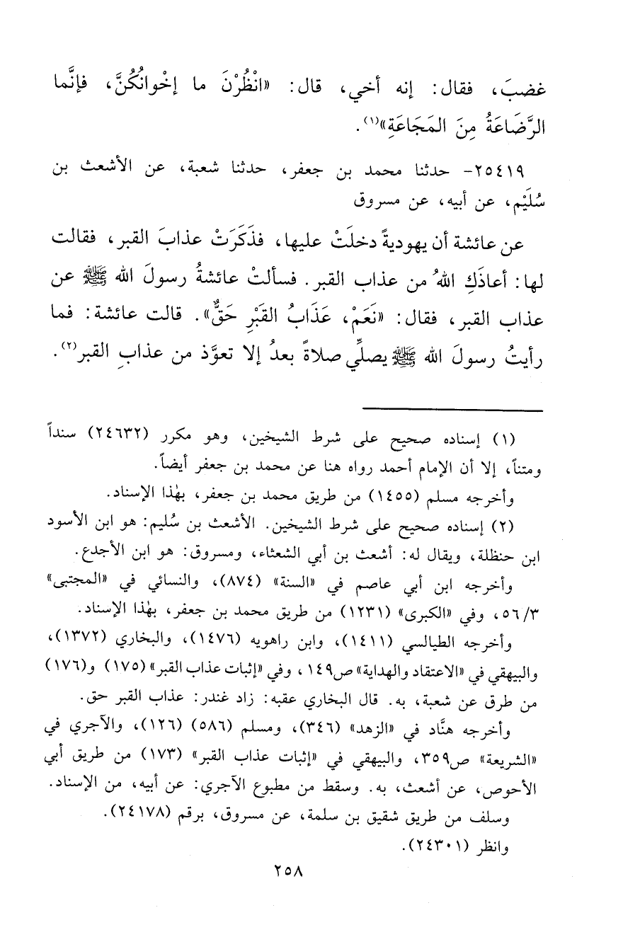 ٢٥٤١٩ - حَدَّثَنَا مُحَمَّدُ بْنُ جَعْفَرٍ، حَدَّثَنَا شُعْبَةُ، عَنِ الْأَشْعَثِ بْنِ سُلَيْمٍ، عَنْ أَبِيهِ، عَنْ مَسْرُوقٍ، عَنْ عَائِشَةَ، أَنَّ يَهُودِيَّةً دَخَلَتْ عَلَيْهَا، فَذَكَرَتْ عَذَابَ الْقَبْرِ، فَقَالَتْ لَهَا: أَعَاذَكِ اللهُ مِنْ عَذَابِ الْقَبْرِ. فَسَأَلَتْ عَائِشَةُ رَسُولَ اللهِ صَلَّى اللهُ عَلَيْهِ وَسَلَّمَ عَنْ عَذَابِ الْقَبْرِ، فَقَالَ: " نَعَمْ، عَذَابُ الْقَبْرِ حَقٌّ " قَالَتْ عَائِشَةُ: فَمَا رَأَيْتُ رَسُولَ اللهِ صَلَّى اللهُ عَلَيْهِ وَسَلَّمَ يُصَلِّي صَلَاةً بَعْدُ إِلَّا تَعَوَّذَ مِنْ عَذَابِ الْقَبْرِ (٢)