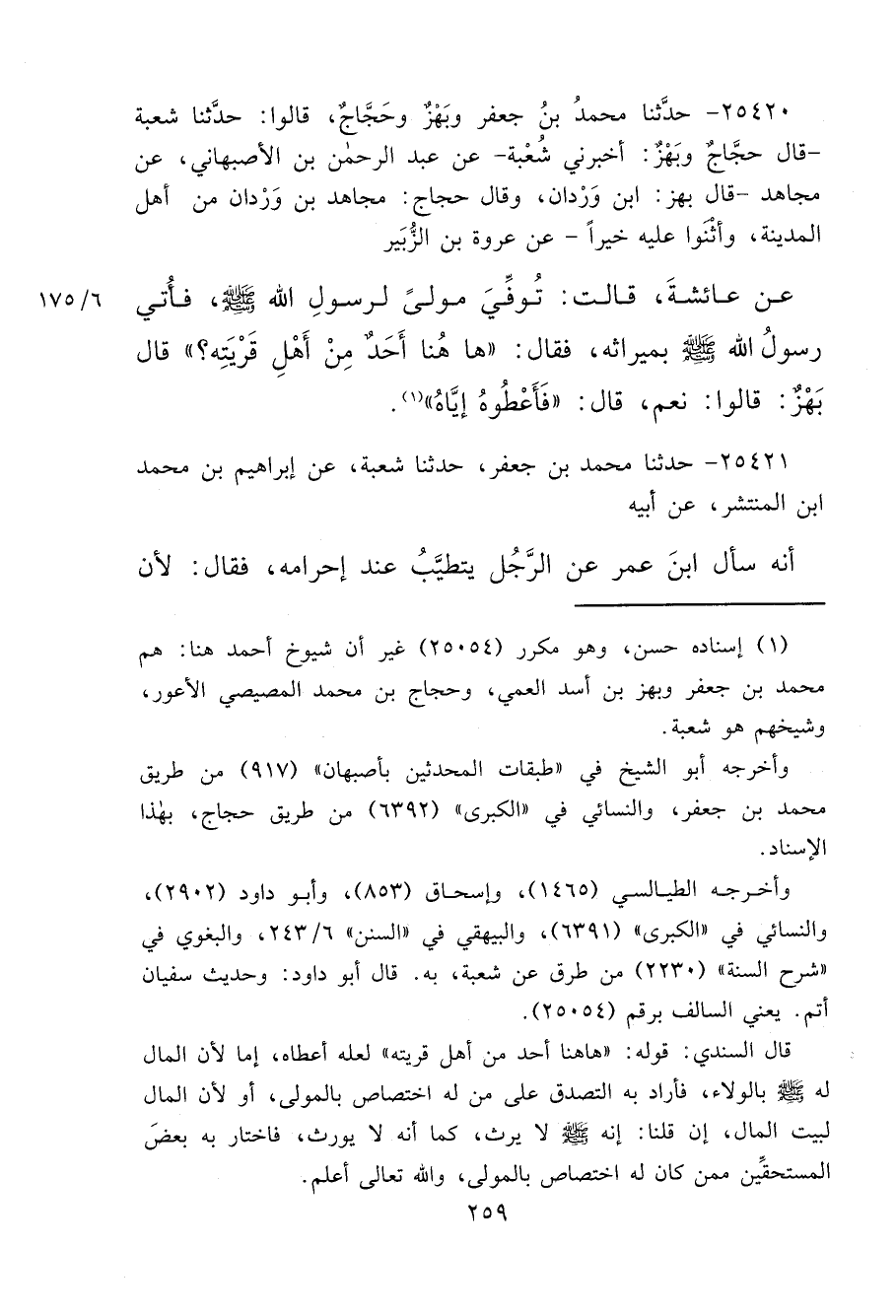 ٢٥٤٢٠ - حَدَّثَنَا مُحَمَّدُ بْنُ جَعْفَرٍ، وَبَهْزٌ، وَحَجَّاجٌ، قَالُوا: حَدَّثَنَا شُعْبَةُ - قَالَ حَجَّاجٌ، وَبَهْزٌ: أَخْبَرَنِي شُعْبَةُ - عَنْ عَبْدِ الرَّحْمَنِ بْنِ الْأَصْبَهَانِيِّ، عَنْ مُجَاهِدٍ - قَالَ بَهْزٌ: ابْنُ وَرْدَانَ، وَقَالَ حَجَّاجٌ: مُجَاهِدُ بْنُ وَرْدَانَ مِنْ أَهْلِ الْمَدِينَةِ، وَأَثْنَوْا عَلَيْهِ خَيْرًا - عَنْ عُرْوَةَ بْنِ الزُّبَيْرِ، عَنْ عَائِشَةَ، قَالَتْ: تُوُفِّيَ مَوْلًى لِرَسُولِ اللهِ صَلَّى اللهُ عَلَيْهِ وَسَلَّمَ، فَأُتِيَ رَسُولُ اللهِ صَلَّى اللهُ عَلَيْهِ وَسَلَّمَ بِمِيرَاثِهِ، فَقَالَ: " هَاهُنَا أَحَدٌ مِنْ أَهْلِ قَرْيَتِهِ؟ "، قَالَ بَهْزٌ، قَالُوا: نَعَمْ، قَالَ: " فَأَعْطُوهُ إِيَّاهُ " (١)