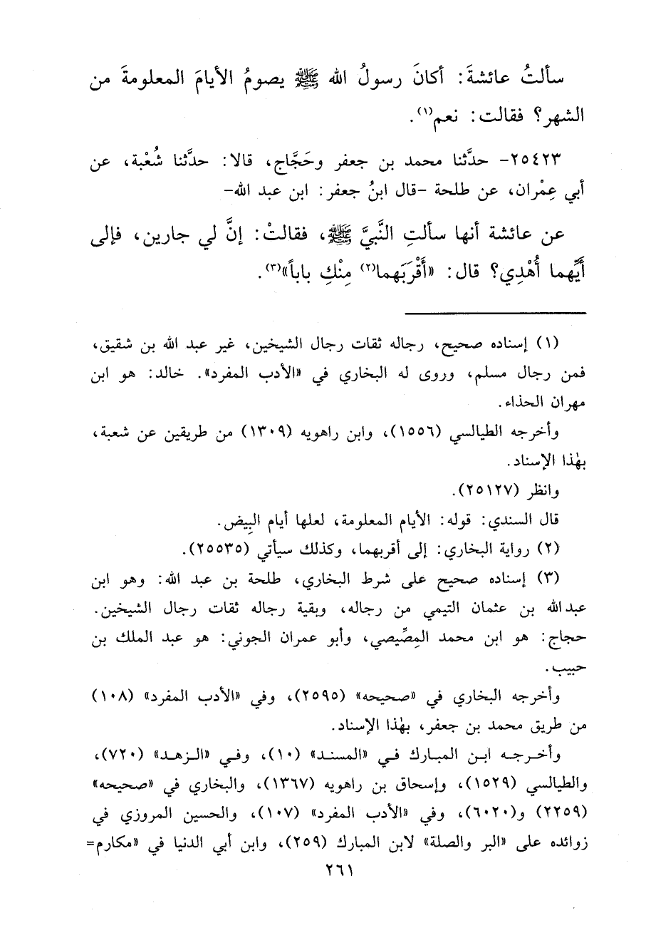سَأَلْتُ عَائِشَةَ: أَكَانَ رَسُولُ اللهِ صَلَّى اللهُ عَلَيْهِ وَسَلَّمَ يَصُومُ الْأَيَّامَ الْمَعْلُومَةَ مِنَ الشَّهْرِ؟ فَقَالَتْ: " نَعَمْ " (١)