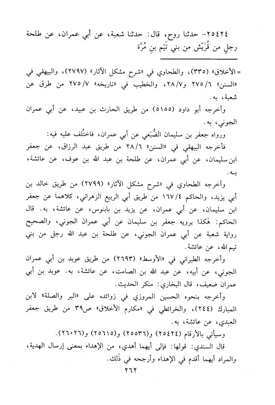 ٢٥٤٢٤ - حَدَّثَنَا رَوْحٌ، قَالَ: حَدَّثَنَا شُعْبَةُ، عَنْ أَبِي عِمْرَانَ، عَنْ طَلْحَةَ رَجُلٌ مِنْ قُرَيْشٍ مِنْ بَنِي تَيْمِ بْنِ مُرَّةَ،