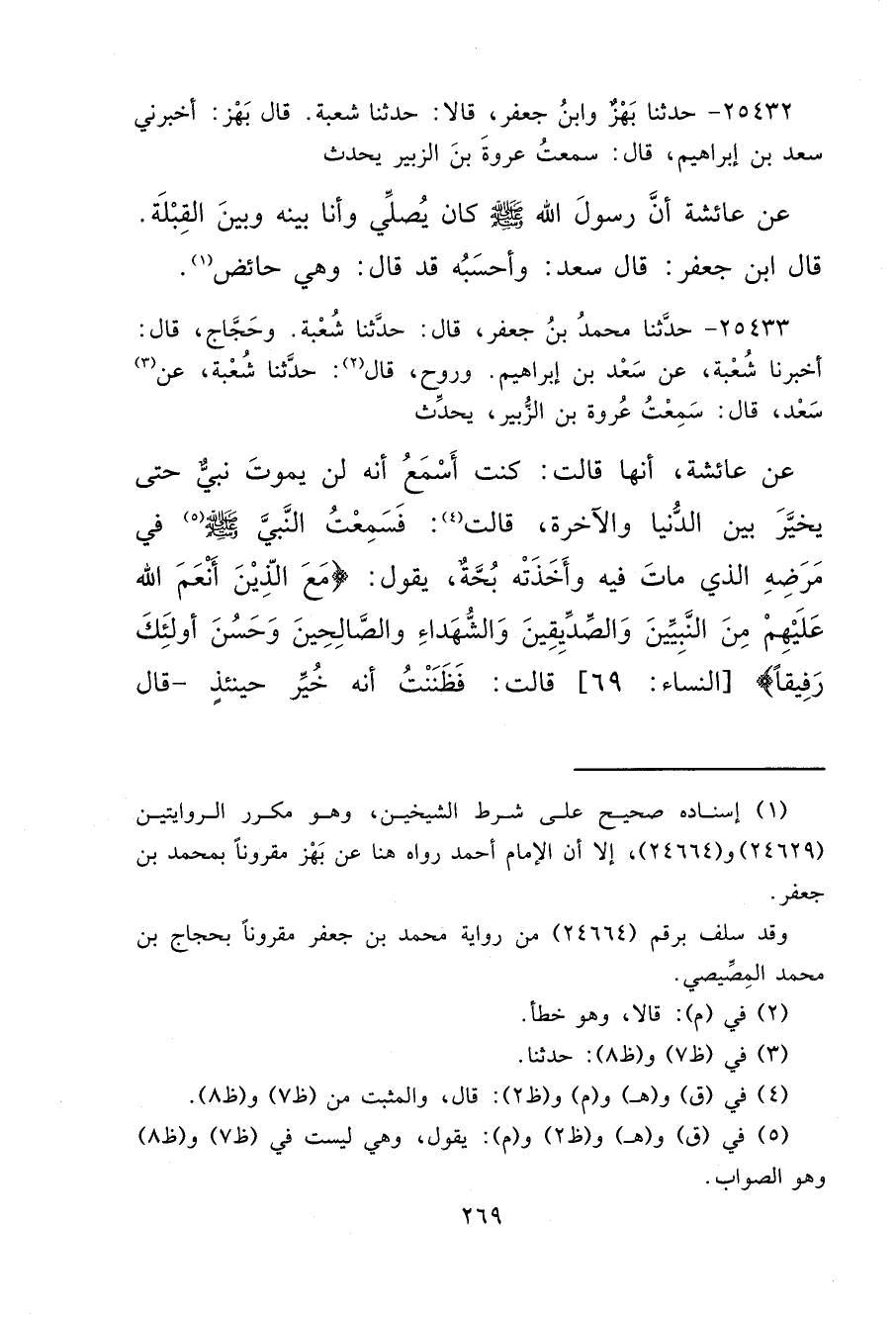٢٥٤٣٣ - حَدَّثَنَا مُحَمَّدُ بْنُ جَعْفَرٍ، قَالَ: حَدَّثَنَا شُعْبَةُ، وَحَجَّاجٌ، قَالَ: أَخْبَرَنَا شُعْبَةُ، عَنْ سَعْدِ بْنِ إِبْرَاهِيمَ، وَرَوْحٌ، قَالَ (٢) : حَدَّثَنَا شُعْبَةُ، عَنْ سَعْدٍ (٣) ، قَالَ: سَمِعْتُ عُرْوَةَ بْنَ الزُّبَيْرِ، يُحَدِّثُ: عَنْ عَائِشَةَ، أَنَّهَا قَالَتْ: كُنْتُ أَسْمَعُ أَنَّهُ لَنْ يَمُوتَ نَبِيٌّ حَتَّى يُخَيَّرَ بَيْنَ الدُّنْيَا وَالْآخِرَةِ، قَالَتْ (٤) : فَسَمِعْتُ النَّبِيَّ صَلَّى اللهُ عَلَيْهِ وَسَلَّمَ (٥) فِي مَرَضِهِ الَّذِي مَاتَ فِيهِ وَأَخَذَتْهُ بُحَّةٌ، يَقُولُ: " {مَعَ الَّذِينَ أَنْعَمَ اللهُ عَلَيْهِمْ مِنَ النَّبِيِّينَ وَالصِّدِّيقِينَ وَالشُّهَدَاءِ وَالصَّالِحِينَ وَحَسُنَ أُولَئِكَ رَفِيقًا} [النساء: ٦٩] " قَالَتْ: فَظَنَنْتُ أَنَّهُ خُيِّرَ حِينَئِذٍ، قَالَ