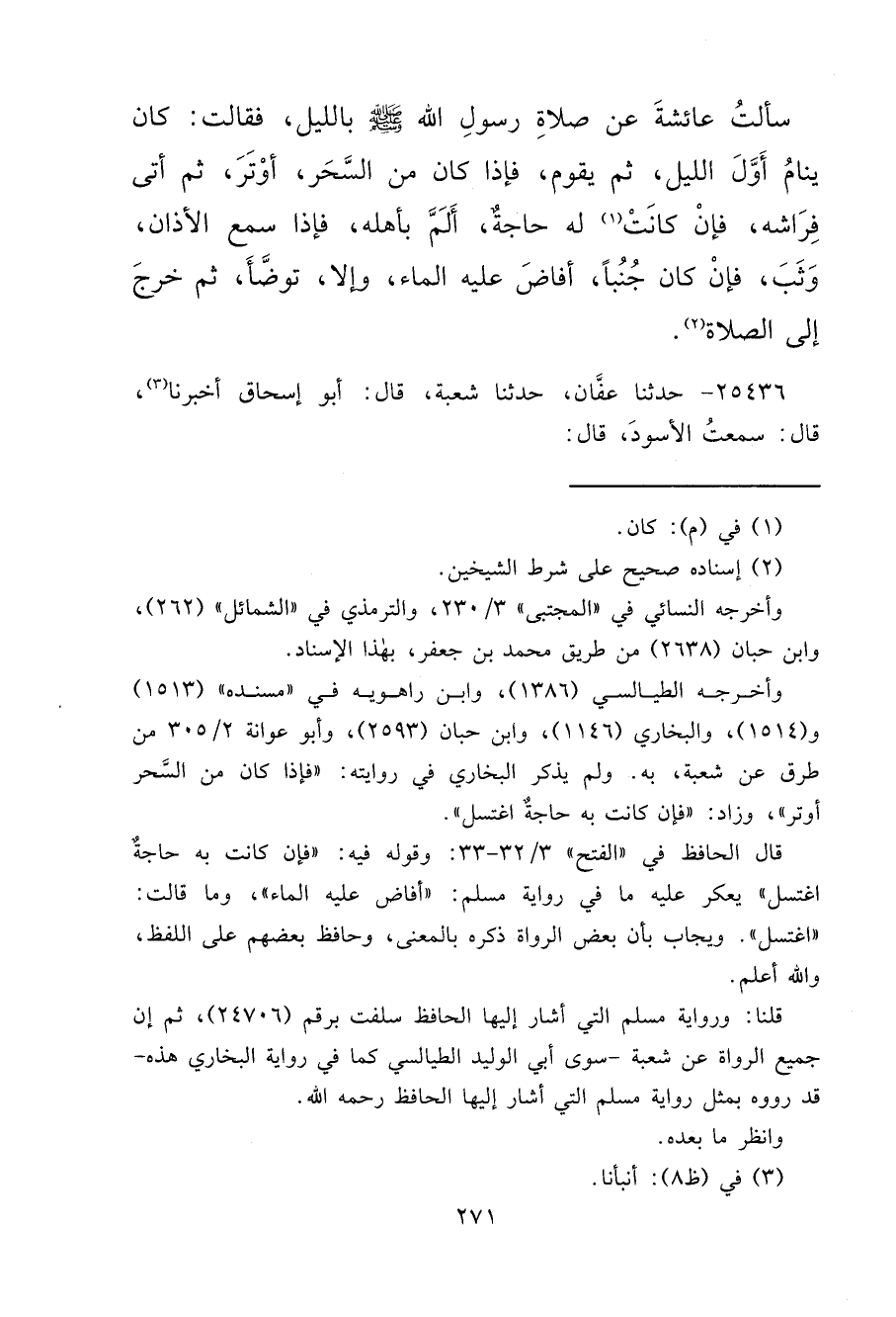 قلنا: ورواية مسلم التي أشار إليها الحافظ سلفت برقم (٢٤٧٠٦) ، ثم أن جميع الرواة عن شعبة -سوى أبي الوليد الطيالسي كما في رواية البخاري هذه- قد رووه بمثل رواية مسلم التي أشار إليها الحافظ رحمه الله.
