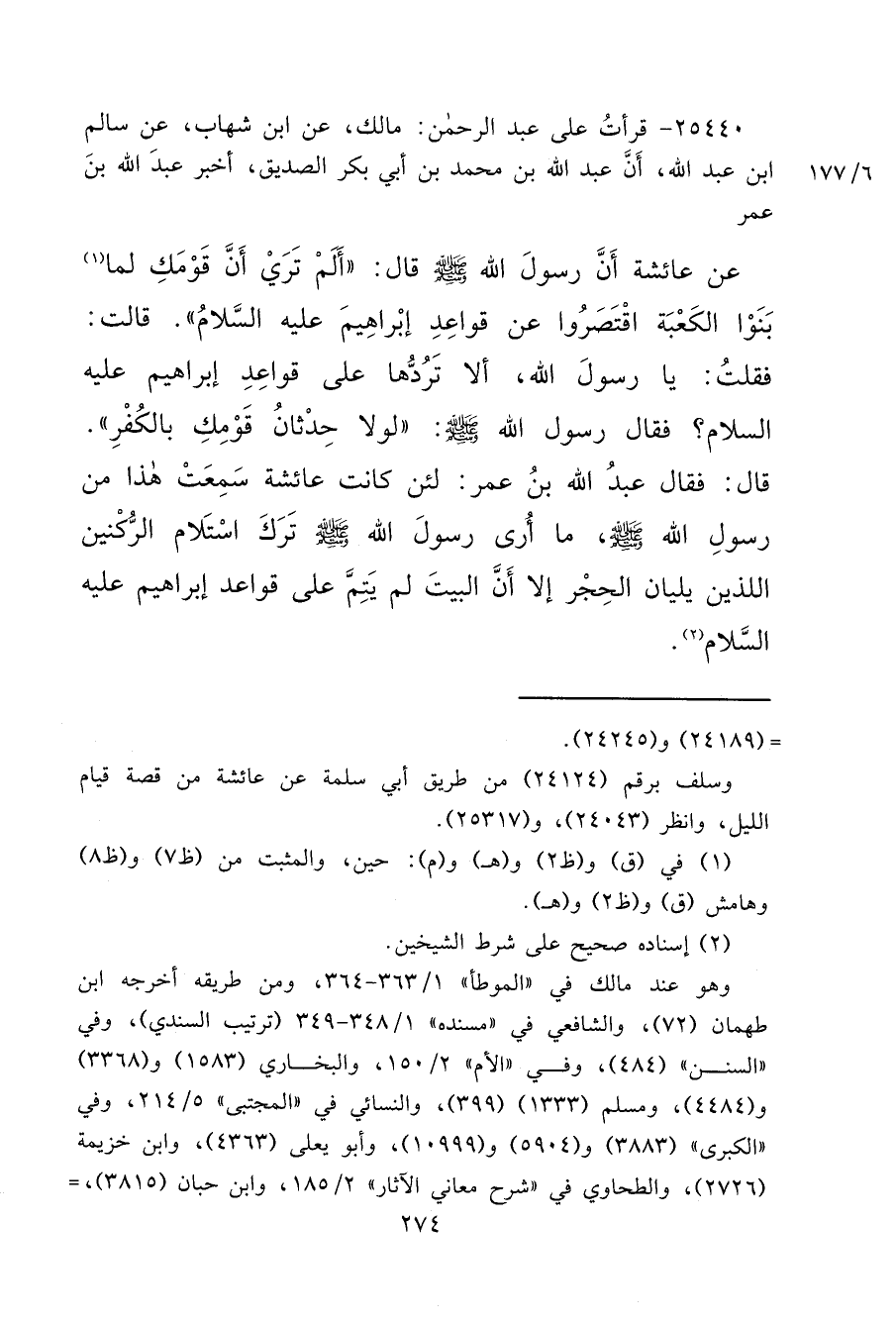 ٢٥٤٤٠ - قَالَ: قَرَأْتُ عَلَى عَبْدِ الرَّحْمَنِ: مَالِكٌ، عَنِ ابْنِ شِهَابٍ، عَنْ سَالِمِ بْنِ عَبْدِ اللهِ، أَنَّ عَبْدَ اللهِ بْنَ مُحَمَّدِ بْنِ أَبِي بَكْرٍ الصِّدِّيقِ، أَخْبَرَ عَبْدَ اللهِ بْنَ عُمَرَ، عَنْ عَائِشَةَ، أَنَّ رَسُولَ اللهِ صَلَّى اللهُ عَلَيْهِ وَسَلَّمَ قَالَ: " أَلَمْ تَرَيْ أَنَّ قَوْمَكِ (١) لَمَّا بَنَوُا الْكَعْبَةَ اقْتَصَرُوا عَنْ قَوَاعِدِ إِبْرَاهِيمَ عَلَيْهِ السَّلَامُ " قَالَتْ: فَقُلْتُ: يَا رَسُولَ اللهِ، أَلَا تَرُدُّهَا عَلَى قَوَاعِدِ إِبْرَاهِيمَ عَلَيْهِ السَّلَامُ؟ قَالَ رَسُولُ اللهِ صَلَّى اللهُ عَلَيْهِ وَسَلَّمَ: " لَوْلَا حِدْثَانُ قَوْمِكِ بِالْكُفْرِ " قَالَ: فَقَالَ عَبْدُ اللهِ بْنُ عُمَرَ: لَئِنْ كَانَتْ عَائِشَةُ سَمِعَتْ هَذَا مِنْ رَسُولِ اللهِ صَلَّى اللهُ عَلَيْهِ وَسَلَّمَ، مَا أُرَى رَسُولَ اللهِ صَلَّى اللهُ عَلَيْهِ وَسَلَّمَ تَرَكَ اسْتِلَامَ الرُّكْنَيْنِ اللَّذَيْنِ يَلِيَانِ الْحِجْرَ إِلَّا أَنَّ الْبَيْتَ لَمْ يَتِمَّ عَلَى قَوَاعِدِ إِبْرَاهِيمَ عَلَيْهِ السَّلَامُ (٢)