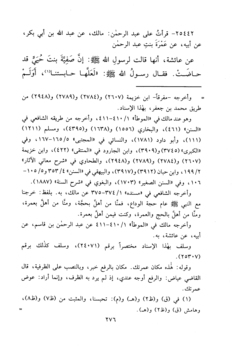 ٢٥٤٤٢ - قَالَ: قَرَأْتُ عَلَى عَبْدِ الرَّحْمَنِ: مَالِكٌ، عَنْ عَبْدِ اللهِ بْنِ أَبِي بَكْرٍ، عَنْ أَبِيهِ، عَنْ عَمْرَةَ بِنْتِ عَبْدِ الرَّحْمَنِ، عَنْ عَائِشَةَ، أَنَّهَا قَالَتْ لِرَسُولِ اللهِ صَلَّى اللهُ عَلَيْهِ وَسَلَّمَ: إِنَّ صَفِيَّةَ بِنْتَ حُيَيٍّ قَدْ حَاضَتْ. فَقَالَ رَسُولُ اللهِ صَلَّى اللهُ عَلَيْهِ وَسَلَّمَ: " لَعَلَّهَا حَابِسَتُنَا (١) ، أَوَلَمْ