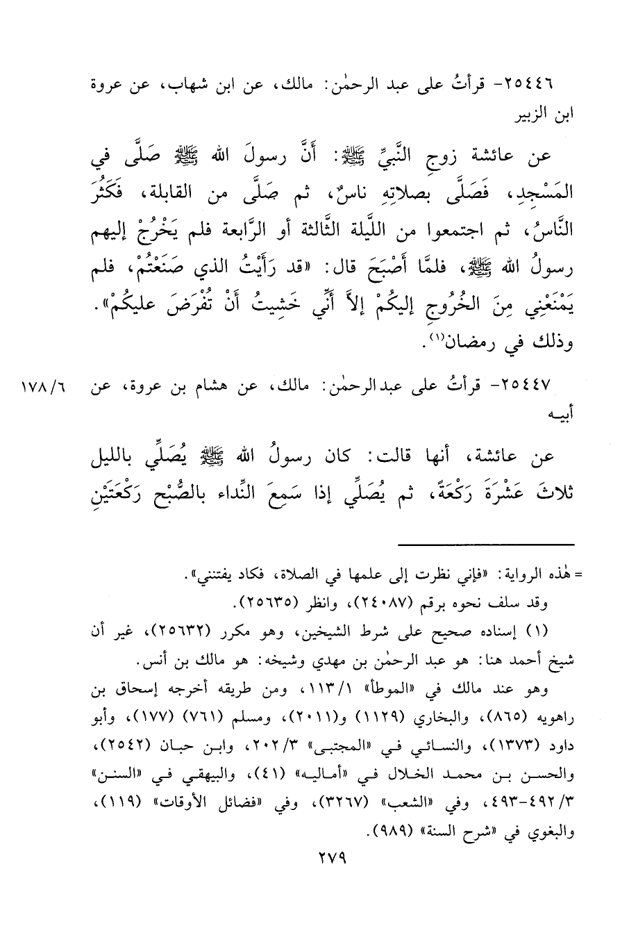 ٢٥٤٤٦ - قَالَ: قَرَأْتُ عَلَى عَبْدِ الرَّحْمَنِ: مَالِكٌ، عَنِ ابْنِ شِهَابٍ، عَنْ عُرْوَةَ بْنِ الزُّبَيْرِ، عَنْ عَائِشَةَ زَوْجِ النَّبِيِّ صَلَّى اللهُ عَلَيْهِ وَسَلَّمَ، أَنَّ رَسُولَ اللهِ صَلَّى اللهُ عَلَيْهِ وَسَلَّمَ صَلَّى فِي الْمَسْجِدِ، فَصَلَّى بِصَلَاتِهِ نَاسٌ، ثُمَّ صَلَّى مِنَ الْقَابِلَةِ، فَكَثُرَ النَّاسُ، ثُمَّ اجْتَمَعُوا مِنَ اللَّيْلَةِ الثَّالِثَةِ أَوِ الرَّابِعَةِ فَلَمْ يَخْرُجْ إِلَيْهِمْ رَسُولُ اللهِ صَلَّى اللهُ عَلَيْهِ وَسَلَّمَ، فَلَمَّا أَصْبَحَ قَالَ: " قَدْ رَأَيْتُ الَّذِي صَنَعْتُمْ، فَلَمْ يَمْنَعْنِي مِنَ الْخُرُوجِ إِلَيْكُمْ إِلَّا أَنِّي خَشِيتُ أَنْ تُفْرَضَ عَلَيْكُمْ " وَذَلِكَ فِي رَمَضَانَ (١)