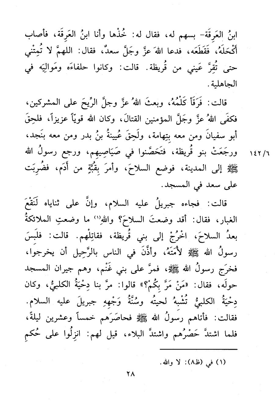 ابْنُ الْعَرِقَةِ، بِسَهْمٍ لَهُ، فَقَالَ لَهُ: خُذْهَا وَأَنَا ابْنُ الْعَرَقَةِ، فَأَصَابَ أَكْحَلَهُ، فَقَطَعَهُ، فَدَعَا اللهَ عَزَّ وَجَلَّ سَعْدٌ، فَقَالَ: اللهُمَّ لَا تُمِتْنِي حَتَّى تُقِرَّ عَيْنِي مِنْ قُرَيْظَةَ. قَالَتْ: وَكَانُوا حُلَفَاءَهُ وَمَوَالِيَهُ فِي الْجَاهِلِيَّةِ. قَالَتْ: فَرَقَأَ كَلْمُهُ، وَبَعَثَ اللهُ عَزَّ وَجَلَّ الرِّيحَ عَلَى الْمُشْرِكِينَ، فَكَفَى الله عَزَّ وَجَلَّ الْمُؤْمِنِينَ الْقِتَالَ، وَكَانَ اللهُ قَوِيًّا عَزِيزًا، فَلَحِقَ أَبُو سُفْيَانَ وَمَنْ مَعَهُ بِتِهَامَةَ، وَلَحِقَ عُيَيْنَةُ بْنُ بَدْرٍ وَمَنْ مَعَهُ بِنَجْدٍ، وَرَجَعَتْ بَنُو قُرَيْظَةَ، فَتَحَصَّنُوا فِي صَيَاصِيهِمْ، وَرَجَعَ رَسُولُ اللهِ صَلَّى اللهُ عَلَيْهِ وَسَلَّمَ إِلَى الْمَدِينَةِ، فَوَضَعَ السِّلَاحَ، وَأَمَرَ بِقُبَّةٍ مِنْ أَدَمٍ، فَضُرِبَتْ عَلَى سَعْدٍ فِي الْمَسْجِدِ. قَالَتْ: فَجَاءَهُ جِبْرِيلُ عَلَيْهِ السَّلَامُ، وَإِنَّ عَلَى ثَنَايَاهُ لَنَقْعُ الْغُبَارِ، فَقَالَ: أَقَدْ وَضَعْتَ السِّلَاحَ؟ وَاللهِ (١) مَا وَضَعَتِ الْمَلَائِكَةُ بَعْدُ السِّلَاحَ، اخْرُجْ إِلَى بَنِي قُرَيْظَةَ، فَقَاتِلْهُمْ. قَالَتْ: فَلَبِسَ رَسُولُ اللهِ صَلَّى اللهُ عَلَيْهِ وَسَلَّمَ لَأْمَتَهُ، وَأَذَّنَ فِي النَّاسِ بِالرَّحِيلِ أَنْ يَخْرُجُوا، فَخَرَجَ رَسُولُ اللهِ صَلَّى اللهُ عَلَيْهِ وَسَلَّمَ، فَمَرَّ عَلَى بَنِي غَنْمٍ، وَهُمْ جِيرَانُ الْمَسْجِدِ حَوْلَهُ، فَقَالَ: " مَنْ مَرَّ بِكُمْ؟ " فَقَالُوا: مَرَّ بِنَا دِحْيَةُ الْكَلْبِيُّ، وَكَانَ دِحْيَةُ الْكَلْبِيُّ تُشْبِهُ لِحْيَتُهُ وَسُنَّةُ وَجْهِهِ جِبْرِيلَ عَلَيْهِ السَّلَامُ. فَقَالَتْ: فَأَتَاهُمْ رَسُولُ اللهِ صَلَّى اللهُ عَلَيْهِ وَسَلَّمَ فَحَاصَرَهُمْ خَمْسًا وَعِشْرِينَ لَيْلَةً، فَلَمَّا اشْتَدَّ حَصْرُهُمْ وَاشْتَدَّ الْبَلَاءُ، قِيلَ لَهُمْ: انْزِلُوا عَلَى حُكْمِ