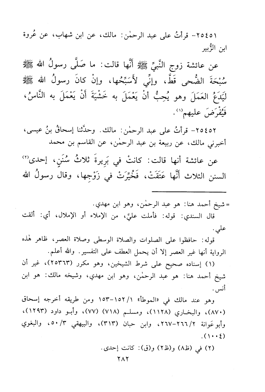 ٢٥٤٥١ - قَرَأْتُ عَلَى عَبْدِ الرَّحْمَنِ: مَالِكٌ، عَنِ ابْنِ شِهَابٍ، عَنْ عُرْوَةَ بْنِ الزُّبَيْرِ، عَنْ عَائِشَةَ زَوْجِ النَّبِيِّ صَلَّى اللهُ عَلَيْهِ وَسَلَّمَ، أَنَّهَا قَالَتْ: " مَا صَلَّى رَسُولُ اللهِ صَلَّى اللهُ عَلَيْهِ وَسَلَّمَ سُبْحَةَ الضُّحَى قَطُّ، وَإِنِّي لَأُسَبِّحُهَا، وَإِنْ كَانَ رَسُولُ اللهِ صَلَّى اللهُ عَلَيْهِ وَسَلَّمَ لَيَدَعُ الْعَمَلَ وَهُوَ يُحِبُّ أَنْ يَعْمَلَ بِهِ خَشْيَةَ أَنْ يَعْمَلَ بِهِ النَّاسُ، فَيُفْرَضَ عَلَيْهِمْ " (١)