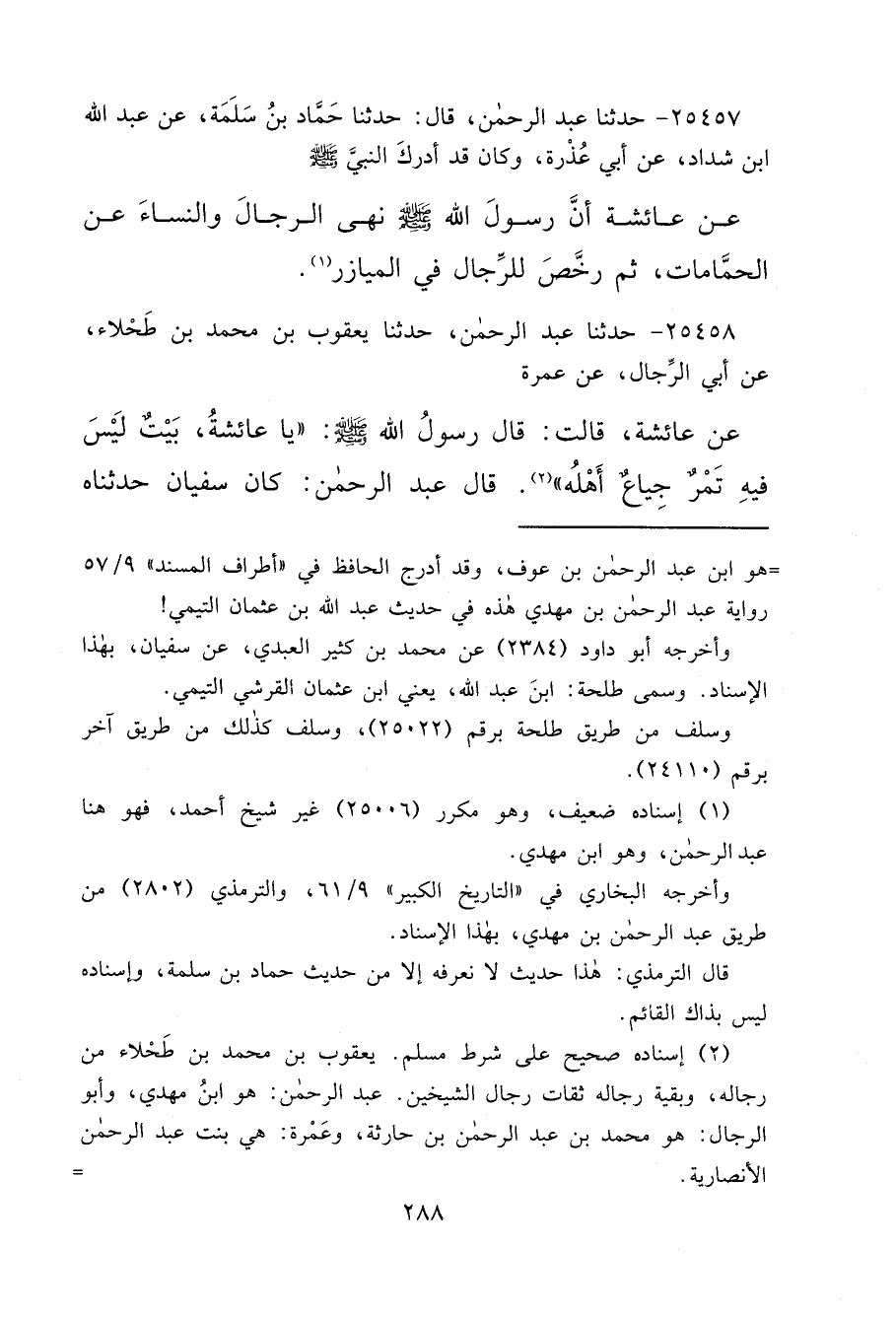 ٢٥٤٥٧ - حَدَّثَنَا عَبْدُ الرَّحْمَنِ، قَالَ: حَدَّثَنَا حَمَّادُ بْنُ سَلَمَةَ، عَنْ عَبْدِ اللهِ بْنِ شَدَّادٍ، عَنْ أَبِي عُذْرَةَ، وَكَانَ قَدْ أَدْرَكَ النَّبِيَّ صَلَّى اللهُ عَلَيْهِ وَسَلَّمَ، عَنْ عَائِشَةَ: " أَنَّ رَسُولَ اللهِ صَلَّى اللهُ عَلَيْهِ وَسَلَّمَ نَهَى الرِّجَالَ وَالنِّسَاءَ عَنِ الْحَمَّامَاتِ، ثُمَّ رَخَّصَ لِلرِّجَالِ فِي الْمَيَازِرِ " (١)