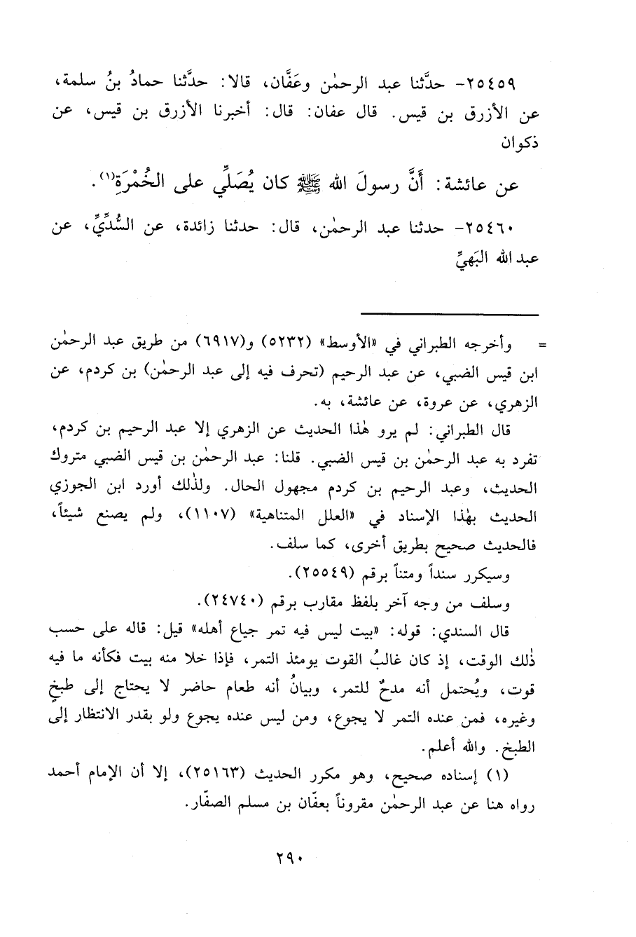 ٢٥٤٥٩ - حَدَّثَنَا عَبْدُ الرَّحْمَنِ، وَعَفَّانُ، قَالَا: حَدَّثَنَا حَمَّادُ بْنُ سَلَمَةَ، عَنِ الْأَزْرَقِ بْنِ قَيْسٍ، قَالَ: عَفَّانُ، قَالَ: أَخْبَرَنَا الْأَزْرَقُ بْنُ قَيْسٍ، عَنْ ذَكْوَانَ، عَنْ عَائِشَةَ: " أَنَّ رَسُولَ اللهِ صَلَّى اللهُ عَلَيْهِ وَسَلَّمَ كَانَ يُصَلِّي عَلَى الْخُمْرَةِ " (١)