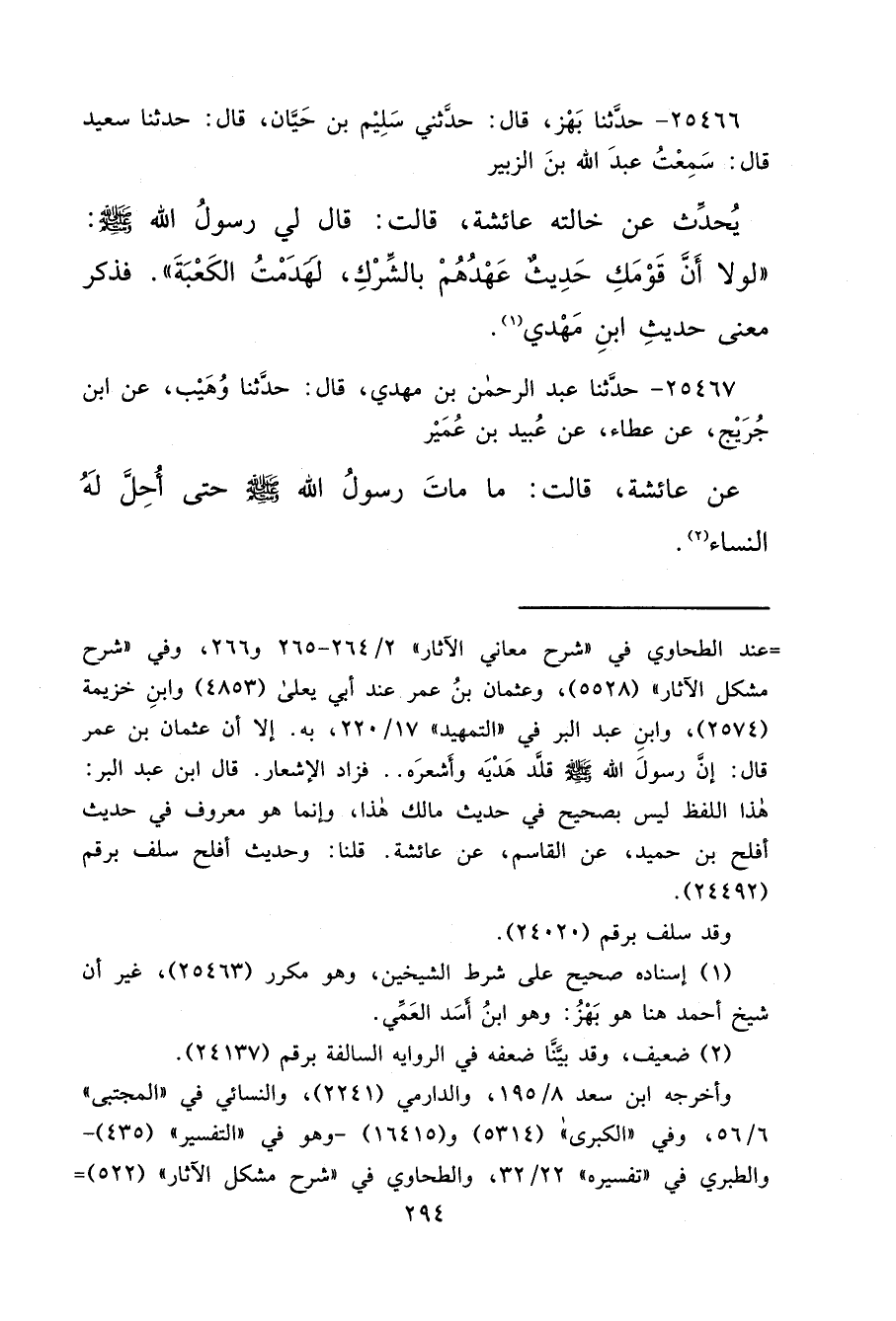 ٢٥٤٦٦ - حَدَّثَنَا بَهْزٌ، قَالَ: حَدَّثَنِي سَلِيمُ بْنُ حَيَّانَ، قَالَ: حَدَّثَنَا سَعِيدٌ، قَالَ: سَمِعْتُ عَبْدَ اللهِ بْنَ الزُّبَيْرِ يُحَدِّثُ، عَنْ خَالَتِهِ عَائِشَةَ، قَالَتْ: قَالَ لِي رَسُولُ اللهِ صَلَّى اللهُ عَلَيْهِ وَسَلَّمَ: " لَوْلَا أَنَّ قَوْمَكِ حَدِيثٌ عَهْدُهُمْ بِالشِّرْكِ لَهَدَمْتُ الْكَعْبَةَ " (١) فَذَكَرَ مَعْنَى حَدِيثِ ابْنِ مَهْدِيٍّ