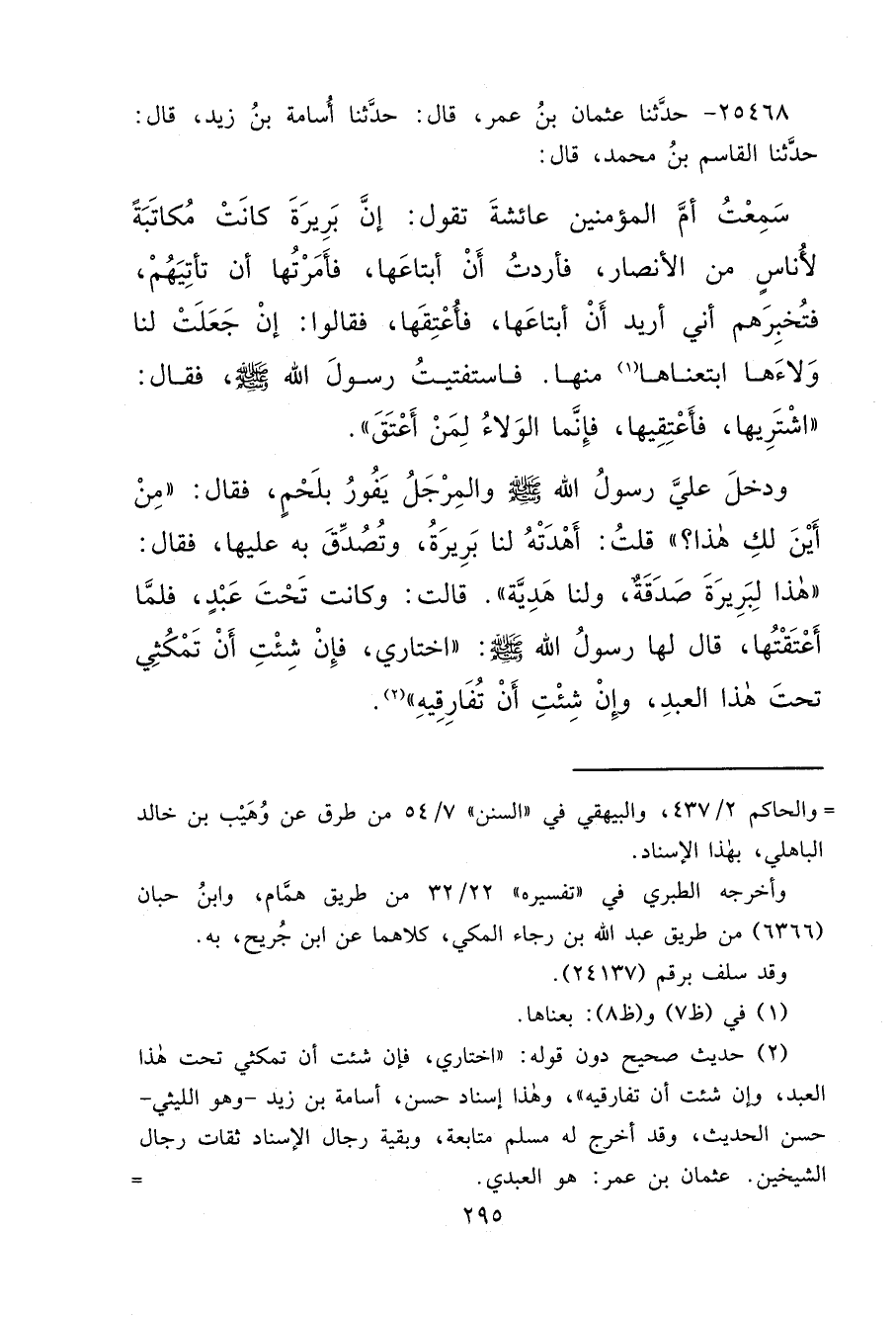 ٢٥٤٦٨ - حَدَّثَنَا عُثْمَانُ بْنُ عُمَرَ، قَالَ: حَدَّثَنَا أُسَامَةُ بْنُ زَيْدٍ، قَالَ: حَدَّثَنَا الْقَاسِمُ بْنُ مُحَمَّدٍ، قَالَ: سَمِعْتُ أُمَّ الْمُؤْمِنِينَ عَائِشَةَ، تَقُولُ: إِنَّ بَرِيرَةَ كَانَتْ مُكَاتِبَةً لِأُنَاسٍ مِنَ الْأَنْصَارِ، فَأَرَدْتُ أَنْ أَبْتَاعَهَا، فَأَمَرْتُهَا أَنْ تَأْتِيَهُمْ، فَتُخْبِرَهُمْ أَنِّي أُرِيدُ أَنْ أَبْتَاعَهَا، فَأُعْتِقَهَا، فَقَالُوا: إِنْ جَعَلْتِ لَنَا وَلَاءَهَا (١) ابْتَعْنَاهَا مِنْهَا. فَاسْتَفْتَيْتُ رَسُولَ اللهِ صَلَّى اللهُ عَلَيْهِ وَسَلَّمَ فَقَالَ: " اشْتَرِيهَا، فَأَعْتِقِيهَا، فَإِنَّمَا الْوَلَاءُ لِمَنْ أَعْتَقَ " وَدَخَلَ عَلَيَّ رَسُولُ اللهِ صَلَّى اللهُ عَلَيْهِ وَسَلَّمَ وَالْمِرْجَلُ يَفُورُ بِلَحْمٍ، فَقَالَ: " مِنْ أَيْنَ لَكِ هَذَا؟ " قُلْتُ: أَهْدَتْهُ لَنَا بَرِيرَةُ، وَتُصُدِّقَ بِهِ عَلَيْهَا، فَقَالَ: " هَذَا لبَرِيرَةَ صَدَقَةٌ، وَلَنَا هَدِيَّةٌ " قَالَتْ: وَكَانَتْ تَحْتَ عَبْدٍ، فَلَمَّا أَعْتَقَهَا، قَالَ لَهَا رَسُولُ اللهِ صَلَّى اللهُ عَلَيْهِ وَسَلَّمَ: " اخْتَارِي، فَإِنْ شِئْتِ أَنْ تَمْكُثِي تَحْتَ هَذَا الْعَبْدِ، وَإِنْ شِئْتِ أَنْ تُفَارِقِيهِ " (٢)