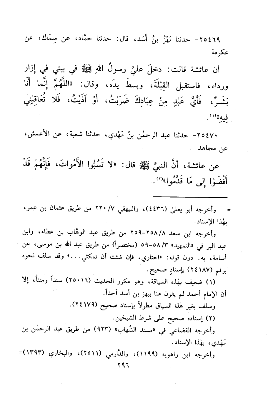 ٢٥٤٦٩ - حَدَّثَنَا بَهْزُ بْنُ أَسَدٍ، قَالَ: حَدَّثَنَا حَمَّادٌ، عَنْ سِمَاكٍ، عَنْ عِكْرِمَةَ، أَنَّ عَائِشَةَ، قَالَتْ: دَخَلَ عَلَيَّ رَسُولُ اللهِ صَلَّى اللهُ عَلَيْهِ وَسَلَّمَ فِي بَيْتِي فِي إِزَارٍ وَرِدَاءٍ، فَاسْتَقْبَلَ الْقِبْلَةَ، وَبَسَطَ يَدَهُ، وَقَالَ: " اللهُمَّ إِنَّمَا أَنَا بَشَرٌ، فَأَيُّ عَبْدٍ مِنْ عِبَادِكَ ضَرَبْتُ، أَوْ آذَيْتُ، فَلَا تُعَاقِبْنِي فِيهِ " (١)