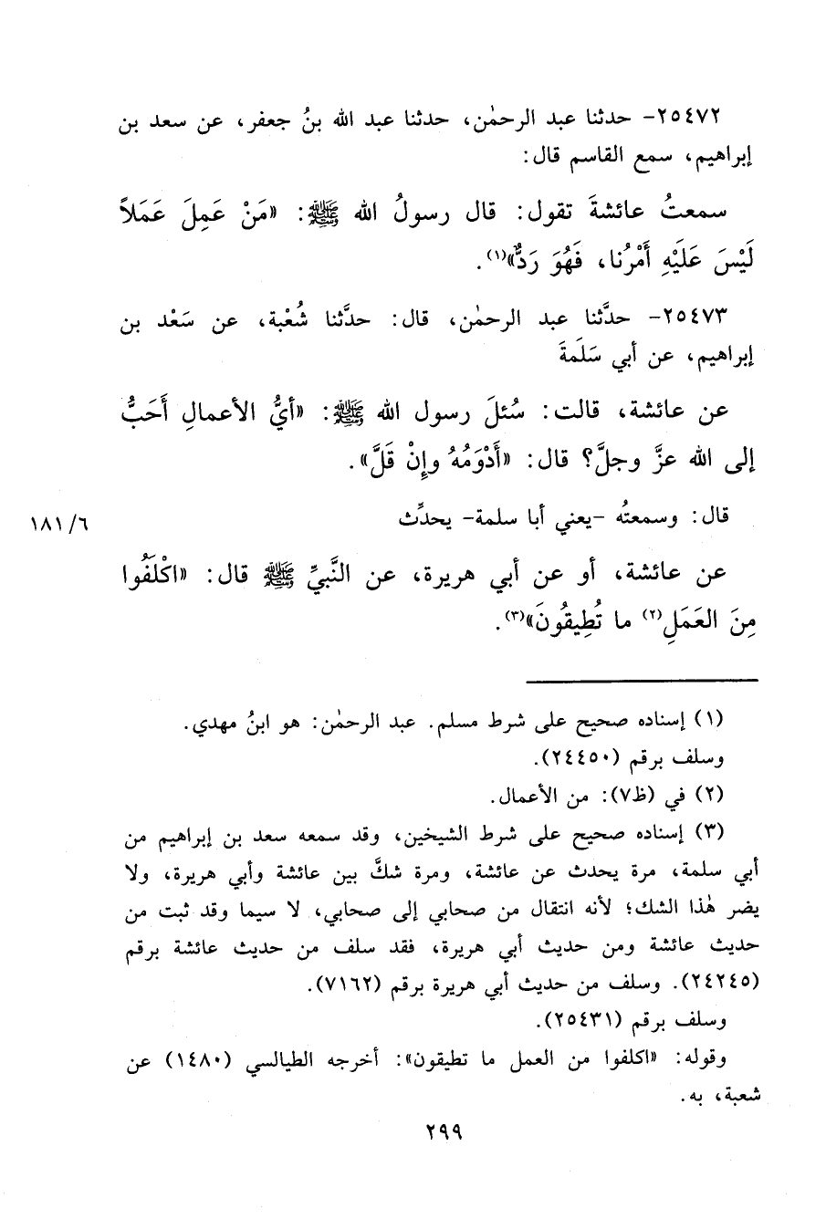 ٢٥٤٧٢ - حَدَّثَنَا عَبْدُ الرَّحْمَنِ، حَدَّثَنَا عَبْدُ اللهِ بْنُ جَعْفَرٍ، عَنْ سَعْدِ بْنِ إِبْرَاهِيمَ، سَمِعَ الْقَاسِمَ، قَالَ: سَمِعْتُ عَائِشَةَ، تَقُولُ: قَالَ رَسُولُ اللهِ صَلَّى اللهُ عَلَيْهِ وَسَلَّمَ: " مَنْ عَمِلَ عَمَلًا لَيْسَ عَلَيْهِ أَمْرُنَا، فَهُوَ رَدٌّ " (١)