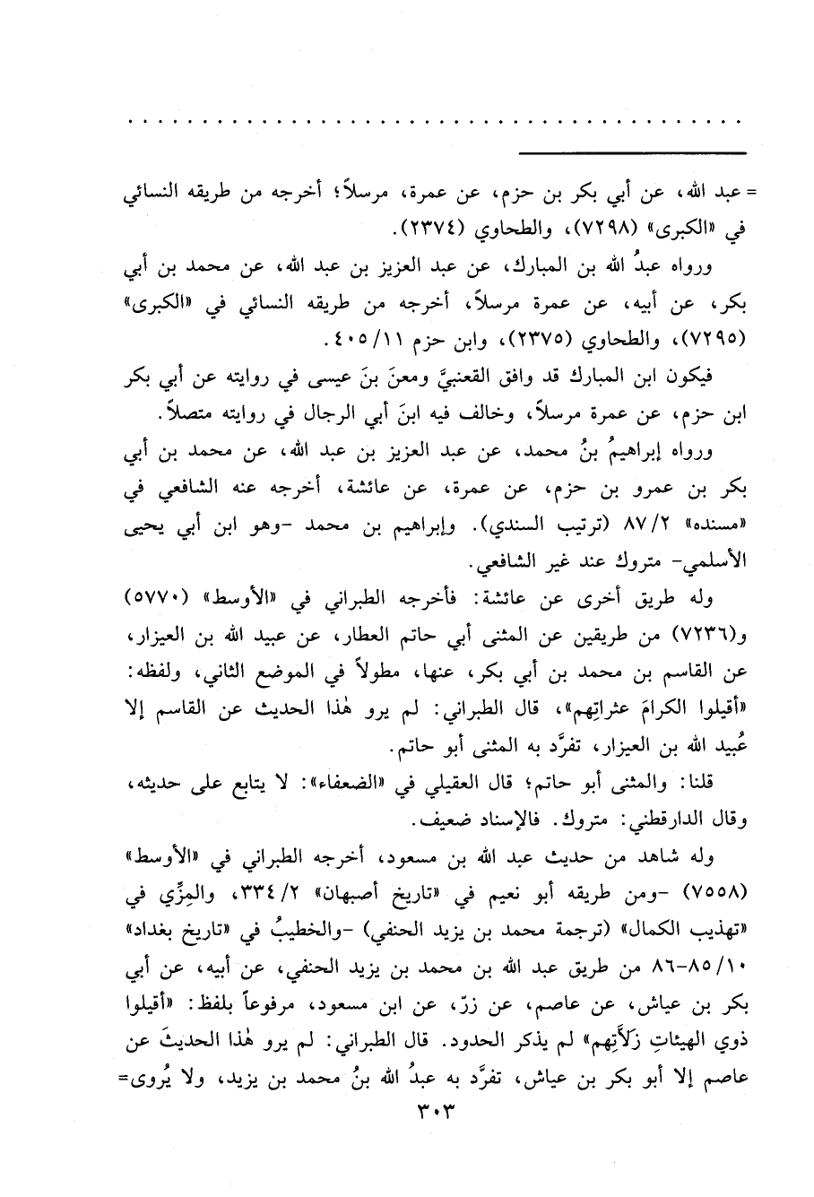 فيكون ابن المبارك قد وافق القعنبيَّ ومعنَ بنَ عيسى في روايته عن أبي بكر ابن حزم، عن عمرة مرسلاً، وخالف فيه ابن أبي الرجال في روايته متصلاً.