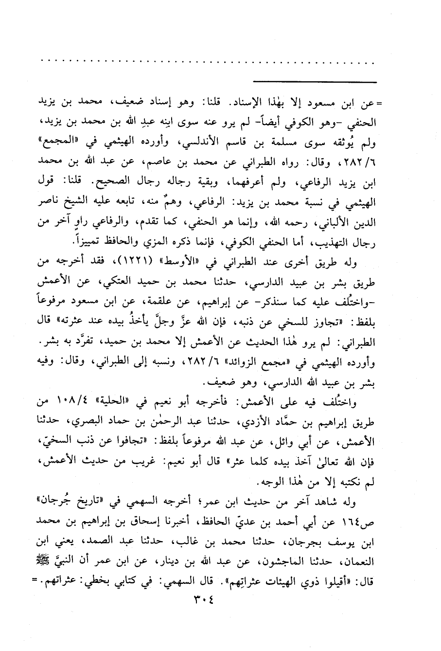 =عن ابن مسعود إلا بهذا الإسناد. قلنا: وهو إسناد ضعيف، محمد بن يزيد الحنفي -وهو الكوفي أيضاً- لم يرو عنه سوى ابنِه عبدِ الله بن محمد بن يزيد، ولم يُوثقه سوى مسلمة بن قاسم الأندلسي، وأورده الهيثمي في "المجمع" ٦/٢٨٢، وقال: رواه الطبراني عن محمد بن عاصم، عن عبد الله بن محمد ابن يزيد الرفاعي، ولم أعرفهما، وبقية رجاله رجال الصحيح. قلنا: قول الهيثمي في نسبة محمد بن يزيد: الرفاعي، وهمٌ منه، تابعه عليه الشيخ ناصر الدين الألباني، رحمه الله، وإنما هو الحنفي، كما تقدم، والرفاعي راوٍ آخر من رجال التهذيب، أما الحنفي الكوفي، فإنما ذكره المزي والحافظ تمييزاً.