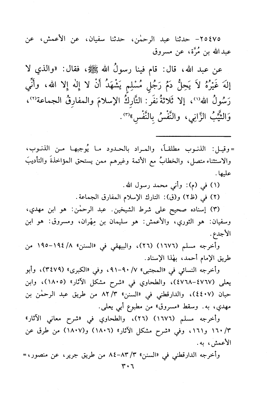 ٢٥٤٧٥ - حَدَّثَنَا عَبْدُ الرَّحْمَنِ، حَدَّثَنَا سُفْيَانُ، عَنِ الْأَعْمَشِ، عَنْ عَبْدِ اللهِ بْنِ مُرَّةَ، عَنْ مَسْرُوقٍ، عَنْ عَبْدِ اللهِ، قَالَ: قَامَ فِينَا رَسُولُ اللهِ صَلَّى اللهُ عَلَيْهِ وَسَلَّمَ فَقَالَ: " وَالَّذِي لَا إِلَهَ غَيْرُهُ لَا يَحِلُّ دَمُ رَجُلٍ مُسْلِمٍ يَشْهَدُ أَنْ لَا إِلَهَ إِلَّا اللهُ، وَأَنِّي رَسُولُ اللهِ (١) ، إِلَّا ثَلَاثَةَ نَفَرٍ: التَّارِكُ الْإِسْلَامَ وَالْمُفَارِقُ الْجَمَاعَةَ (٢) ، وَالثَّيِّبُ الزَّانِي، وَالنَّفْسُ بِالنَّفْسِ ". (٣)