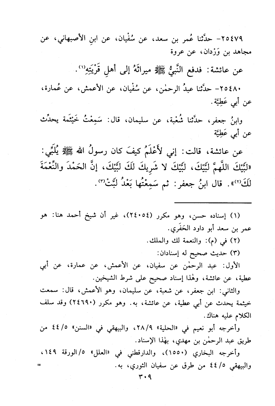 ٢٥٤٨٠ - حَدَّثَنَا عَبْدُ الرَّحْمَنِ، عَنْ سُفْيَانَ، عَنِ الْأَعْمَشِ، عَنْ عُمَارَةَ، عَنْ أَبِي عَطِيَّةَ، وَابْنُ جَعْفَرٍ، حَدَّثَنَا شُعْبَةُ، عَنْ سُلَيْمَانَ، قَالَ: سَمِعْتُ خَيْثَمَةَ يُحَدِّثُ، عَنْ أَبِي عَطِيَّةَ، عَنْ عَائِشَةَ، قَالَتْ: إِنِّي لَأَعْلَمُ كَيْفَ كَانَ رَسُولُ اللهِ صَلَّى اللهُ عَلَيْهِ وَسَلَّمَ يُلَبِّي: " لَبَّيْكَ اللهُمَّ لَبَّيْكَ، لَبَّيْكَ لَا شَرِيكَ لَكَ لَبَّيْكَ، إِنَّ الْحَمْدَ وَالنِّعْمَةَ لَكَ (٢) " قَالَ ابْنُ جَعْفَرٍ: ثُمَّ سَمِعْتُهَا بَعْدُ لَبَّتْ (٣)