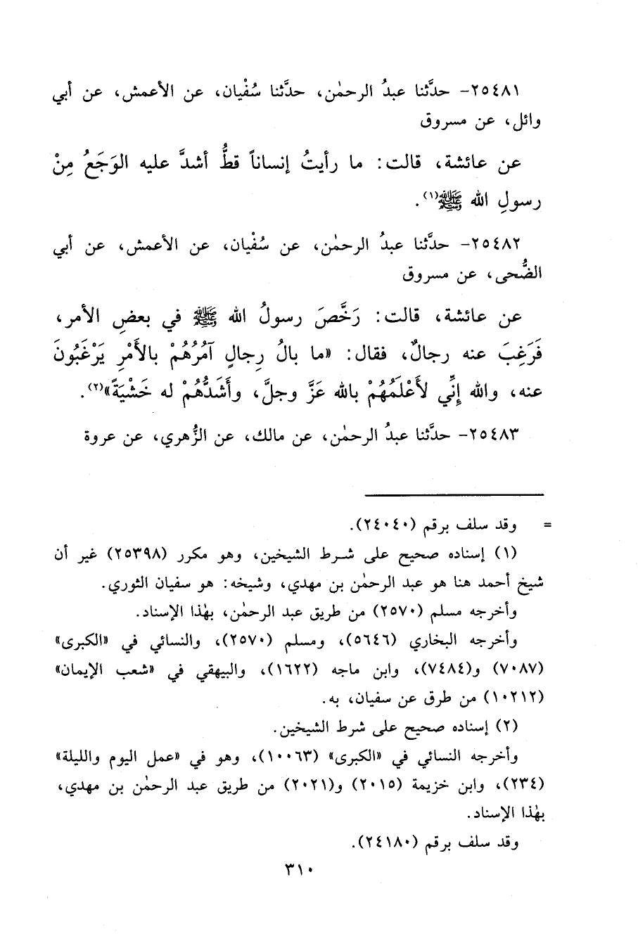 ٢٥٤٨١ - حَدَّثَنَا عَبْدُ الرَّحْمَنِ، حَدَّثَنَا سُفْيَانُ، عَنِ الْأَعْمَشِ، عَنْ أَبِي وَائِلٍ، عَنْ مَسْرُوقٍ، عَنْ عَائِشَةَ، قَالَتْ: " مَا رَأَيْتُ إِنْسَانًا قَطُّ أَشَدَّ عَلَيْهِ الْوَجَعُ مِنْ رَسُولِ اللهِ صَلَّى اللهُ عَلَيْهِ وَسَلَّمَ " (١)