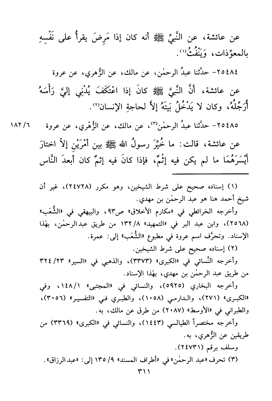 ٢٥٤٨٥ - حَدَّثَنَا عَبْدُ الرَّحْمَنِ (٣) ، عَنْ مَالِكٍ، عَنِ الزُّهْرِيِّ، عَنْ عُرْوَةَ، عَنْ عَائِشَةَ، قَالَتْ: " مَا خُيِّرَ رَسُولُ اللهِ صَلَّى اللهُ عَلَيْهِ وَسَلَّمَ بَيْنَ أَمْرَيْنِ إِلَّا اخْتَارَ أَيْسَرَهُمَا مَا لَمْ يَكُنْ فِيهِ إِثْمٌ، فَإِذَا كَانَ فِيهِ إِثْمٌ كَانَ أَبْعَدَ النَّاسِ