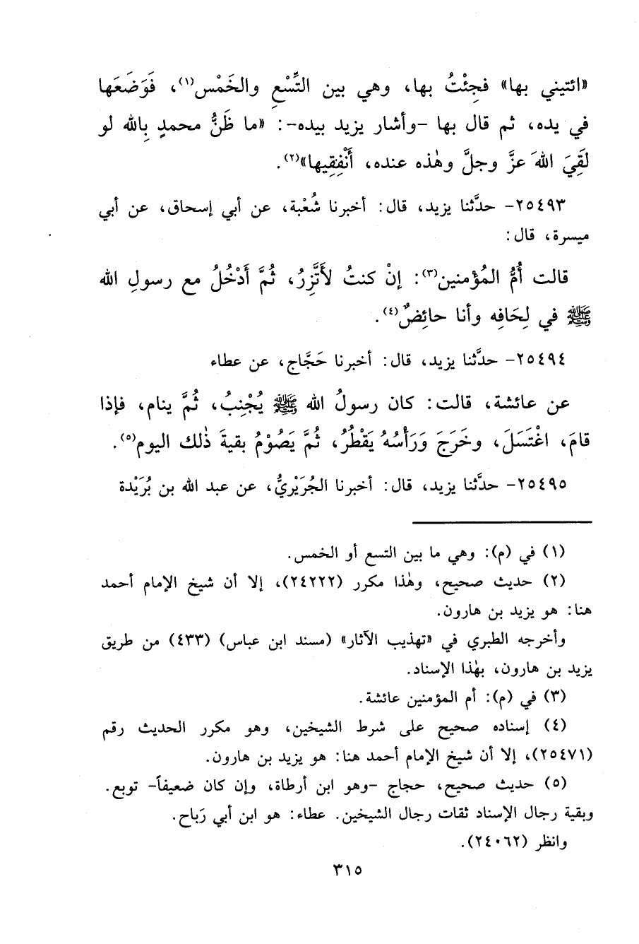 ٢٥٤٩٣ - قَالَ: حَدَّثَنَا يَزِيدُ، قَالَ: أَخْبَرَنَا شُعْبَةُ، عَنْ أَبِي إِسْحَاقَ، عَنْ أَبِي مَيْسَرَةَ، قَالَ: قَالَتْ أُمُّ الْمُؤْمِنِينَ (٣) : " إِنْ كُنْتُ لَأَتَّزِرُ، ثُمَّ أَدْخُلُ مَعَ رَسُولِ اللهِ صَلَّى اللهُ عَلَيْهِ وَسَلَّمَ فِي لِحَافِهِ وَأَنَا حَائِضٌ " (٤)
