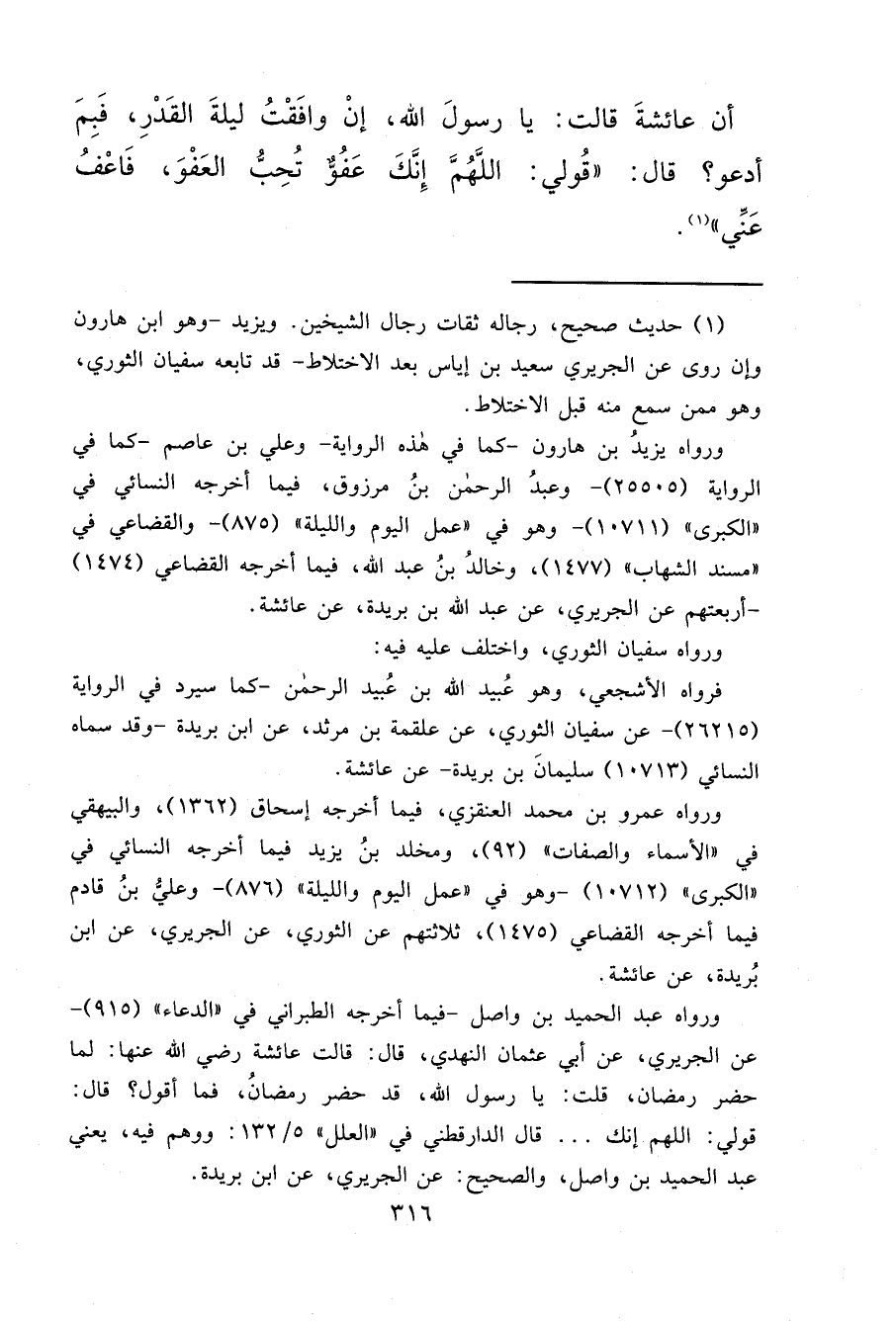 أَنَّ عَائِشَةَ، قَالَتْ: يَا رَسُولَ اللهِ، إِنْ وَافَقْتُ لَيْلَةَ الْقَدْرِ، فَبِمَ أَدْعُو؟ قَالَ: " قُولِي: اللهُمَّ إِنَّكَ عَفُوٌّ تُحِبُّ الْعَفْوَ، فَاعْفُ عَنِّي " (١)