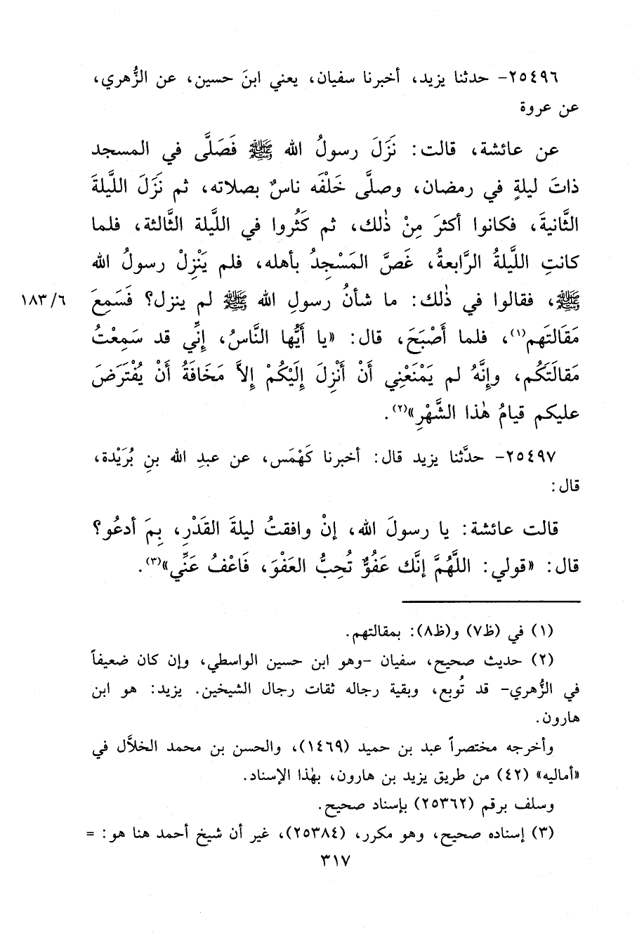 ٢٥٤٩٦ - حَدَّثَنَا يَزِيدُ، أَخْبَرَنَا سُفْيَانُ يَعْنِي ابْنَ حُسَيْنٍ، عَنِ الزُّهْرِيِّ، عَنْ عُرْوَةَ، عَنْ عَائِشَةَ، قَالَتْ: نَزَلَ رَسُولُ اللهِ صَلَّى اللهُ عَلَيْهِ وَسَلَّمَ فَصَلَّى فِي الْمَسْجِدِ ذَاتَ لَيْلَةٍ فِي رَمَضَانَ، وَصَلَّى خَلْفَهُ نَاسٌ بِصَلَاتِهِ، ثُمَّ نَزَلَ اللَّيْلَةَ الثَّانِيَةَ، فَكَانُوا أَكْثَرَ مِنْ ذَلِكَ، ثُمَّ كَثُرُوا فِي اللَّيْلَةِ الثَّالِثَةِ، فَلَمَّا كَانَتِ اللَّيْلَةُ الرَّابِعَةُ، غَصَّ الْمَسْجِدُ بِأَهْلِهِ، فَلَمْ يَنْزِلْ رَسُولُ اللهِ صَلَّى اللهُ عَلَيْهِ وَسَلَّمَ، فَقَالُوا فِي ذَلِكَ: مَا شَأْنُ رَسُولِ اللهِ صَلَّى اللهُ عَلَيْهِ وَسَلَّمَ لَمْ يَنْزِلْ؟ فَسَمِعَ مَقَالَتَهُمْ، (١) فَلَمَّا أَصْبَحَ، قَالَ: " يَا أَيُّهَا النَّاسُ، إِنِّي قَدْ سَمِعْتُ مَقَالَتَكُمْ، وَإِنَّهُ لَمْ يَمْنَعْنِي أَنْ أَنْزِلَ إِلَيْكُمْ إِلَّا مَخَافَةَ أَنْ يُفْتَرَضَ عَلَيْكُمْ قِيَامُ هَذَا الشَّهْرِ " (٢)