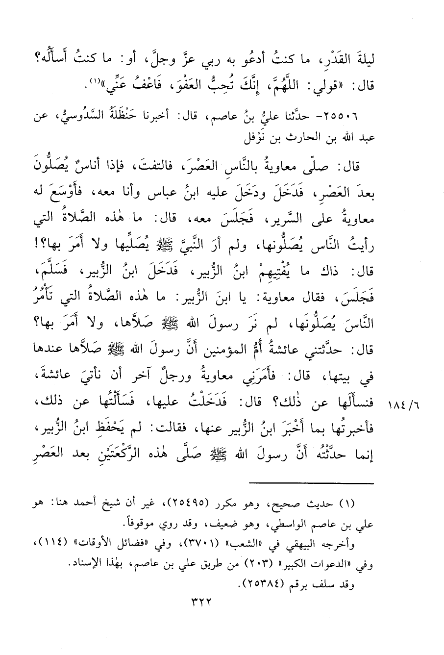 ٢٥٥٠٦ - حَدَّثَنَا عَلِيُّ بْنُ عَاصِمٍ، قَالَ: أَخْبَرَنَا حَنْظَلَةُ السَّدُوسِيُّ، عَنْ عَبْدِ اللهِ بْنِ الْحَارِثِ بْنِ نَوْفَلٍ، قَالَ: صَلَّى مُعَاوِيَةُ بِالنَّاسِ الْعَصْرَ، فَالْتَفَتَ، فَإِذَا أُنَاسٌ يُصَلُّونَ بَعْدَ الْعَصْرِ، فَدَخَلَ وَدَخَلَ عَلَيْهِ ابْنُ عَبَّاسٍ وَأَنَا مَعَهُ، فَأَوْسَعَ لَهُ مُعَاوِيَةُ عَلَى السَّرِيرِ، فَجَلَسَ مَعَهُ، قَالَ: مَا هَذِهِ الصَّلَاةُ الَّتِي رَأَيْتُ النَّاسَ يُصَلُّونَهَا، وَلَمْ أَرَ النَّبِيَّ صَلَّى اللهُ عَلَيْهِ وَسَلَّمَ يُصَلِّيهَا وَلَا أَمَرَ بِهَا؟ قَالَ: ذَاكَ مَا يُفْتِيهِمْ ابْنُ الزُّبَيْرِ، فَدَخَلَ ابْنُ الزُّبَيْرِ، فَسَلَّمَ، فَجَلَسَ، فَقَالَ مُعَاوِيَةُ: يَا ابْنَ الزُّبَيْرِ: مَا هَذِهِ الصَّلَاةُ الَّتِي تَأْمُرُ النَّاسَ يُصَلُّونَهَا، لَمْ نَرَ رَسُولَ اللهِ صَلَّى اللهُ عَلَيْهِ وَسَلَّمَ صَلَّاهَا، وَلَا أَمَرَ بِهَا؟ قَالَ: حَدَّثَتْنِي عَائِشَةُ، أُمُّ الْمُؤْمِنِينَ أَنَّ رَسُولَ اللهِ صَلَّى اللهُ عَلَيْهِ وَسَلَّمَ صَلَّاهَا عِنْدَهَا فِي بَيْتِهَا، قَالَ: فَأَمَرَنِي مُعَاوِيَةُ وَرَجُلٌ آخَرُ أَنْ نَأْتِيَ عَائِشَةَ، فَنَسْأَلَهَا عَنْ ذَلِكَ؟ قَالَ: فَدَخَلْتُ عَلَيْهَا، فَسَأَلْتُهَا عَنْ ذَلِكَ، فَأَخْبَرْتُهَا بِمَا أَخْبَرَ ابْنُ الزُّبَيْرِ عَنْهَا، فَقَالَتْ: لَمْ يَحْفَظْ ابْنُ الزُّبَيْرِ، إِنَّمَا حَدَّثْتُهُ أَنَّ رَسُولَ اللهِ صَلَّى اللهُ عَلَيْهِ وَسَلَّمَ صَلَّى هَذِهِ الرَّكْعَتَيْنِ بَعْدَ الْعَصْرِ