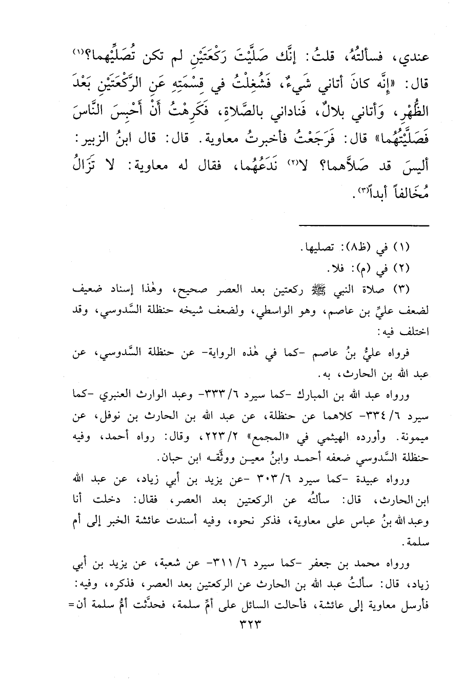 ورواه عبيدة -كما سيرد ٦/٣٠٣- عن يزيد بن أبي زياد، عن عبد الله ابن الحارث، قال: سألتُه عن الركعتين بعد العصر، فقال: دخلت أنا وعبد الله بنُ عباس على معاوية، فذكر نحوه، وفيه أسندت عائشة الخبر إلى أم سلمة.