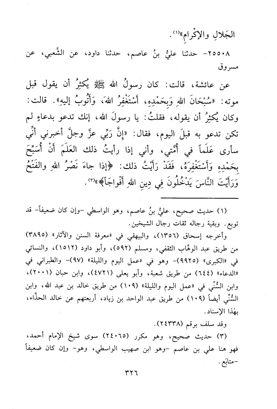 ٢٥٥٠٨ - حَدَّثَنَا عَلِيُّ بْنُ عَاصِمٍ، حَدَّثَنَا دَاوُدُ، عَنِ الشَّعْبِيِّ، عَنْ مَسْرُوقٍ، عَنْ عَائِشَةَ، قَالَتْ: كَانَ رَسُولُ اللهِ صَلَّى اللهُ عَلَيْهِ وَسَلَّمَ يُكْثِرُ أَنْ يَقُولَ قَبْلَ مَوْتِهِ: " سُبْحَانَ اللهِ وَبِحَمْدِهِ، أَسْتَغْفِرُ اللهَ، وَأَتُوبُ إِلَيْهِ " قَالَتْ: وَكَانَ يُكْثِرُ أَنْ يَقُولَهُ، فَقُلْتُ: يَا رَسُولَ اللهِ، إِنَّكَ تَدْعُو بِدُعَاءٍ لَمْ تَكُنْ تَدْعُو بِهِ قَبْلَ الْيَوْمِ، فَقَالَ: " إِنَّ رَبِّي عَزَّ وَجَلَّ أَخْبَرَنِي أَنِّي سَأَرَى عَلَمًا فِي أُمَّتِي، وَأَنِّي إِذَا رَأَيْتُ ذَلِكَ الْعَلَمَ أَنْ أُسَبِّحَ بِحَمْدِهِ وَأَسْتَغْفِرَهُ، فَقَدْ رَأَيْتُ ذَلِكَ: {إِذَا جَاءَ نَصْرُ اللهِ وَالْفَتْحُ، وَرَأَيْتَ النَّاسَ يَدْخُلُونَ فِي دِينِ اللهِ أَفْوَاجًا} [النصر: ٢] " (٢)