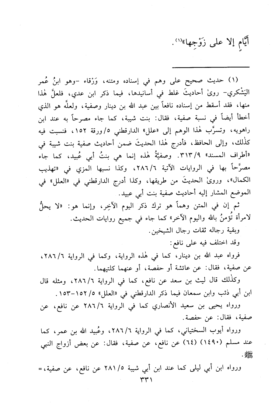 (١) حديث صحيح على وهم في إسناده ومتنه، وَرْقاء -وهو ابن عُمر اليَشْكري- روى أحاديثَ غلط في أسانيدها، فيما ذكر ابن عدي، فلعلَّ هذا منها، فقد أسقط من إسناده نافعاً بين عبد الله بن دينار وصفية، ولعلَّه هو الذي أخطأ أيضاً في نسبة صفية، فقال: بنت شيبة، كما جاء مصرحاً به عند ابن