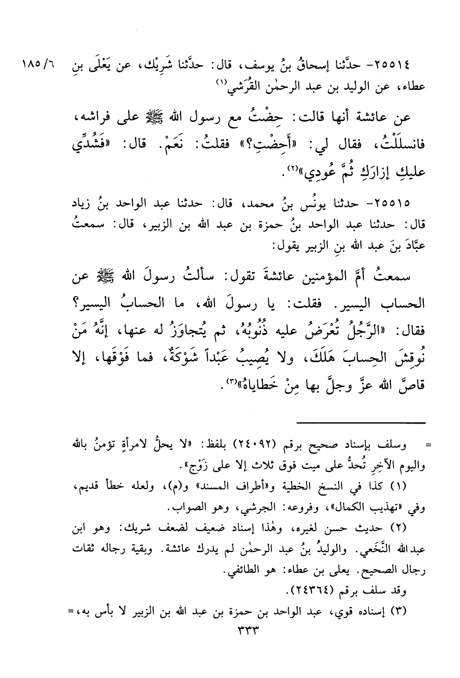 ٢٥٥١٤ - حَدَّثَنَا إِسْحَاقُ بْنُ يُوسُفَ، قَالَ: حَدَّثَنَا شَرِيكٌ، عَنْ يَعْلَى بْنِ عَطَاءٍ، عَنِ الْوَلِيدِ بْنِ عَبْدِ الرَّحْمَنِ الْجُرَشِيِّ، (١) عَنْ عَائِشَةَ، أَنَّهَا قَالَتْ: حِضْتُ مَعَ رَسُولِ اللهِ صَلَّى اللهُ عَلَيْهِ وَسَلَّمَ عَلَى فِرَاشِهِ، فَانْسَلَلْتُ، فَقَالَ لِي: " أَحِضْتِ؟ " فَقُلْتُ: نَعَمْ. قَالَ: " فَشُدِّي عَلَيْكِ إِزَارَكَ ثُمَّ عُودِي " (٢)