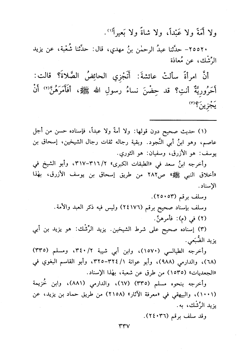 ٢٥٥٢٠ - حَدَّثَنَا عَبْدُ الرَّحْمَنِ بْنُ مَهْدِيٍّ، قَالَ: حَدَّثَنَا شُعْبَةُ، عَنْ يَزِيدَ الرِّشْكِ، عَنْ مُعَاذَةَ: أَنَّ امْرَأَةً سَأَلَتْ عَائِشَةَ: أَتُجْزِئُ الْحَائِضُ الصَّلَاةَ؟ قَالَتْ: أَحَرُورِيَّةٌ أَنْتِ؟ " قَدْ حِضْنَ نِسَاءُ رَسُولِ اللهِ صَلَّى اللهُ عَلَيْهِ وَسَلَّمَ، أَفَأَمَرَهُنَّ (٢) أَنْ يَجْزِينَ؟ " (٣)