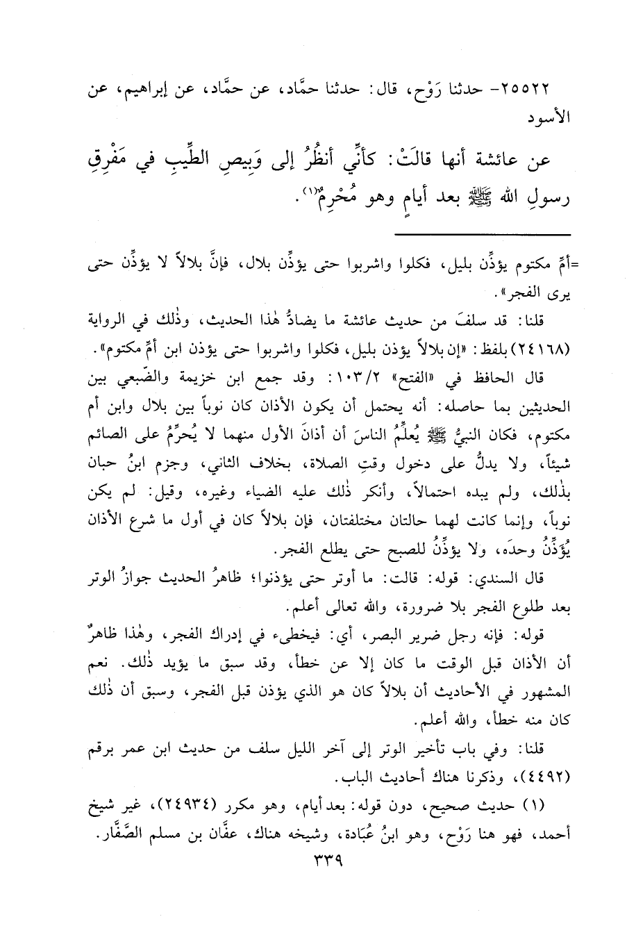 قلنا: قد سلفَ من حديث عائشة ما يضادُّ هذا الحديث، وذلك في الرواية (٢٤١٦٨) بلفظ: "إن بلالاً يؤذن بليل، فكلوا واشربوا حتى يؤذن ابن أمِّ مكتوم".
