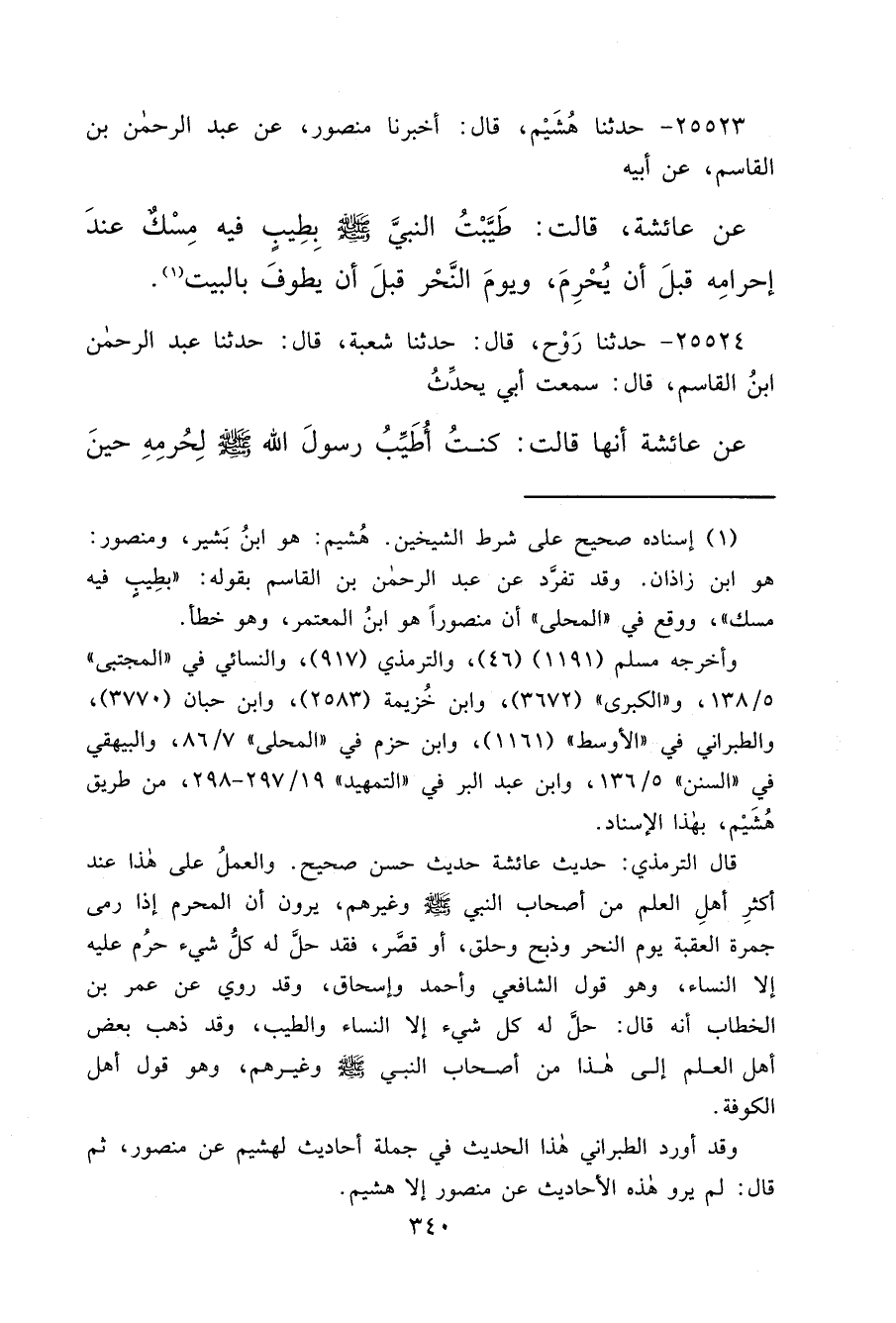 ٢٥٥٢٣ - حَدَّثَنَا هُشَيْمٌ، قَالَ: أَخْبَرَنَا مَنْصُورٌ، عَنْ عَبْدِ الرَّحْمَنِ بْنِ الْقَاسِمِ، عَنْ أَبِيهِ، عَنْ عَائِشَةَ، قَالَتْ: " طَيَّبْتُ النَّبِيَّ صَلَّى اللهُ عَلَيْهِ وَسَلَّمَ بِطِيبٍ فِيهِ مِسْكٌ عِنْدَ إِحْرَامِهِ قَبْلَ أَنْ يُحْرِمَ، وَيَوْمَ النَّحْرِ قَبْلَ أَنْ يَطُوفَ بِالْبَيْتِ " (١)